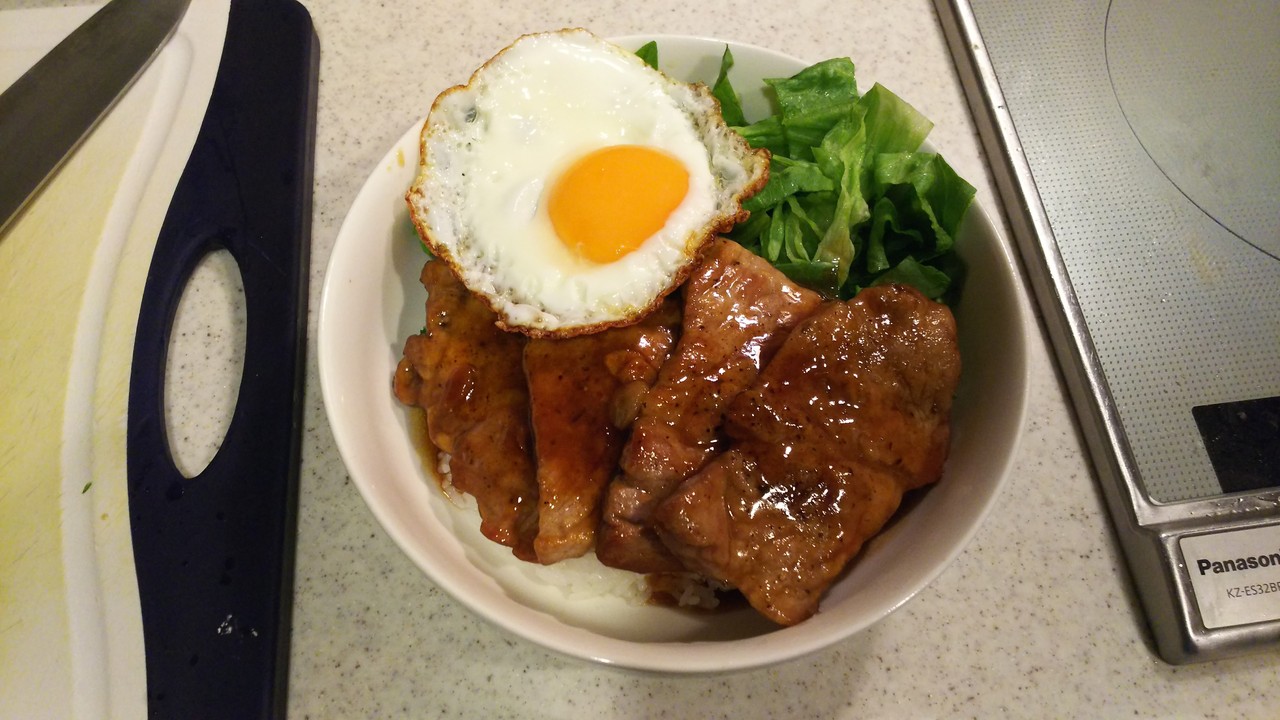 10.さらに豚肉、焼いた後のタレ、目玉焼きをのせたら出来上がり