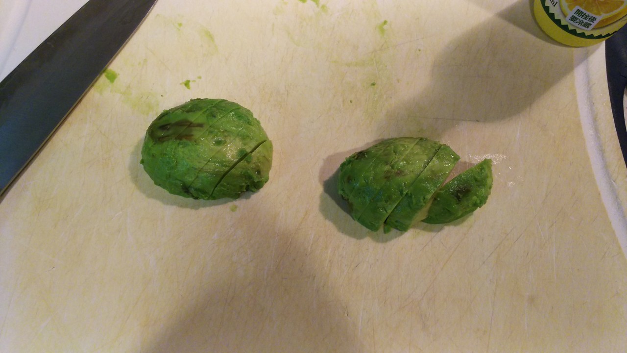 3.アボカド(1個)は半分に切って皮を剥き斜め1センチ幅でスライスしておきます