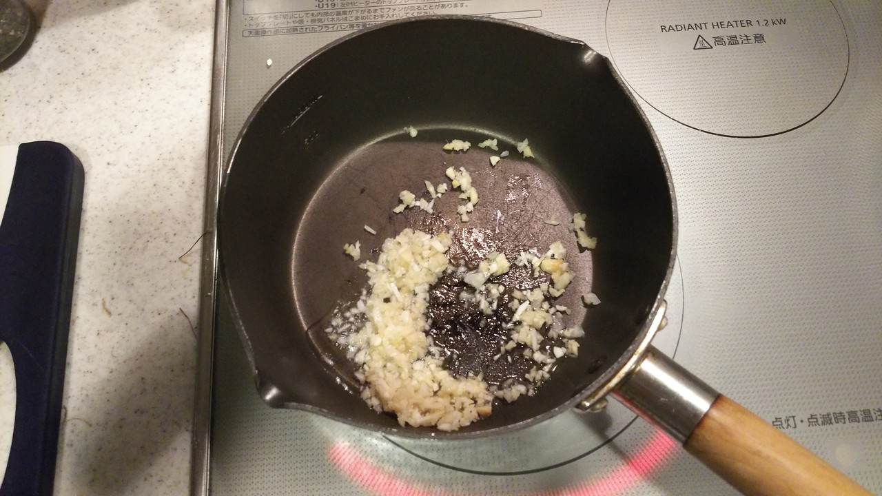2.鍋にサラダ油(大さじ2)を入れてニンニク、ショウガを炒めます