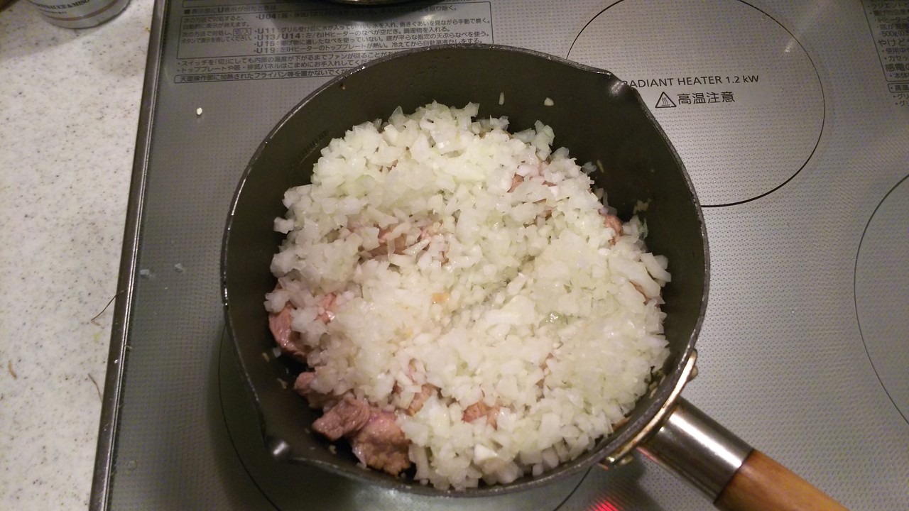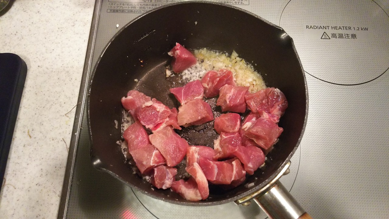 4.豚肉の表面に火が通ったらタマネギを入れます