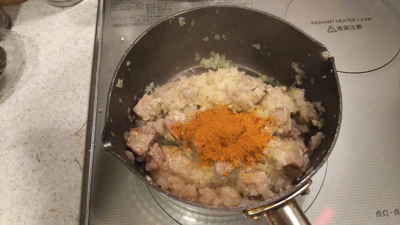 5.タマネギがしんなりしたらカレー粉 大さじ3を入れます