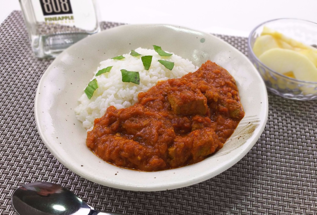 11.お皿にご飯(適量)を盛ってバジルの葉(4枚)をのせてカレーをかけたら出来上がり