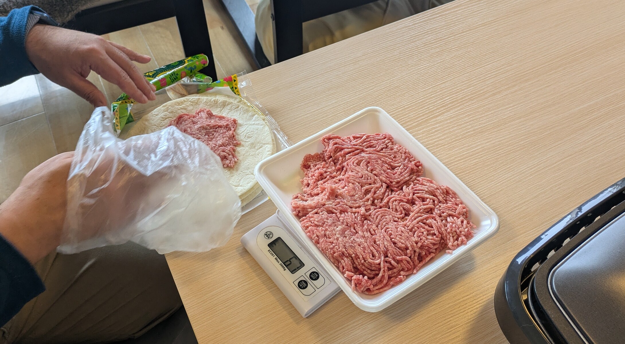 まずトルティーヤに生のひき肉を薄く押し付けます