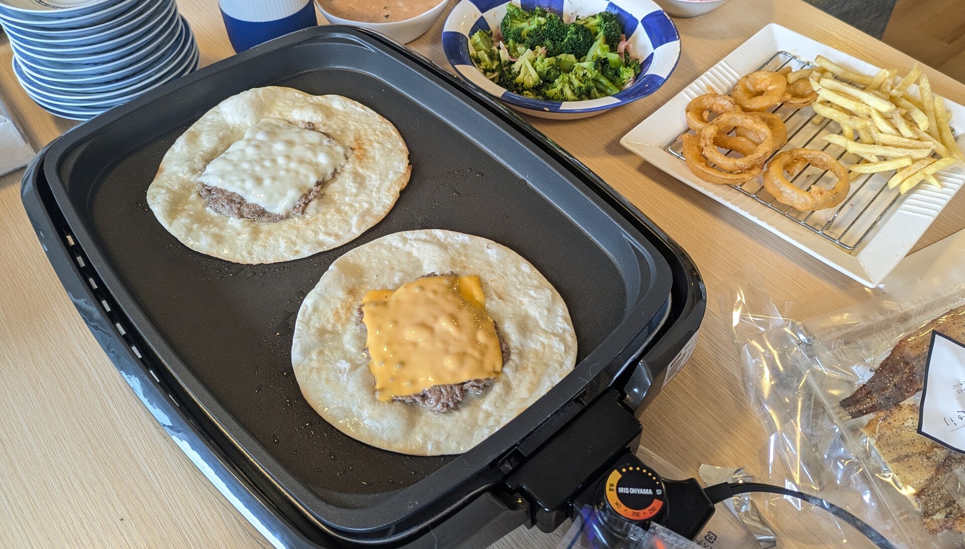 ホットプレートでひき肉を下にして焼きます