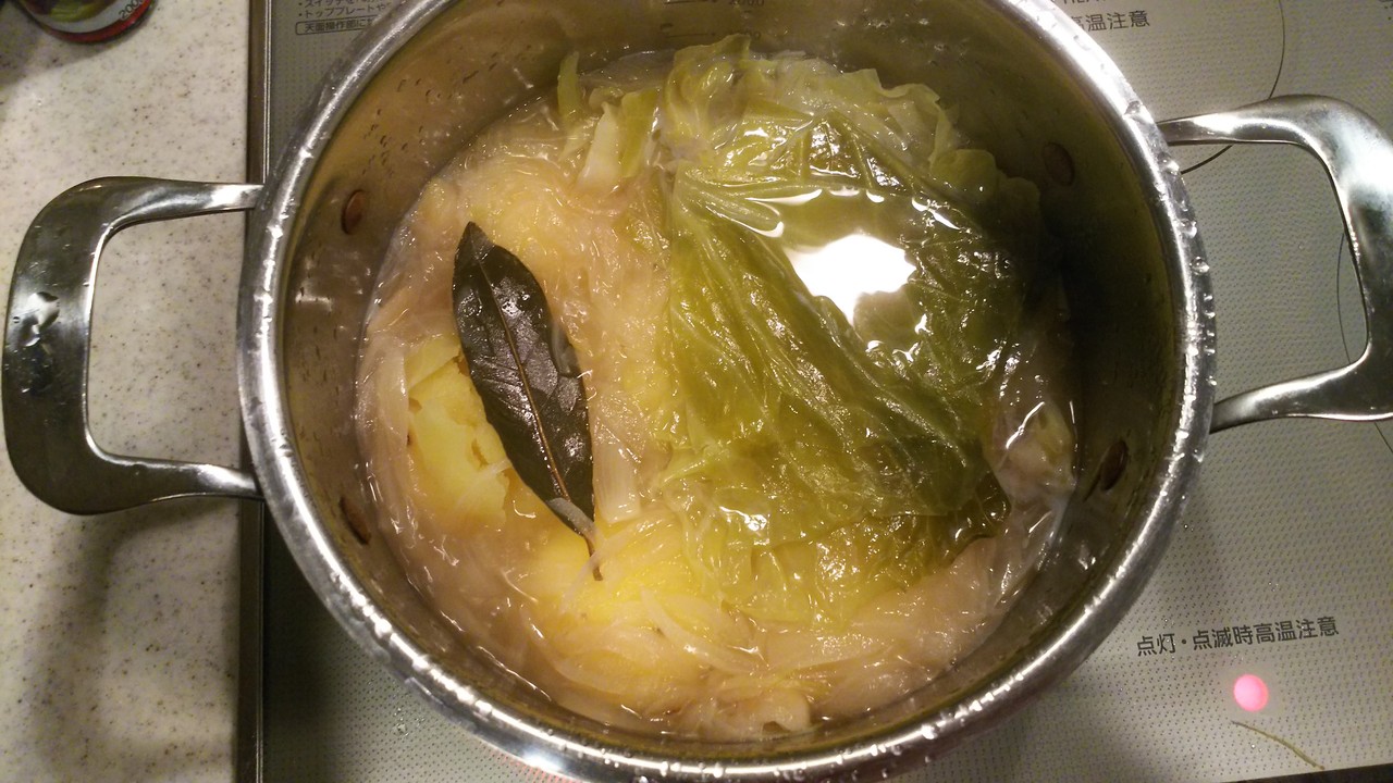 5.煮立ったらジャガイモ、キャベツを入れて弱火にします