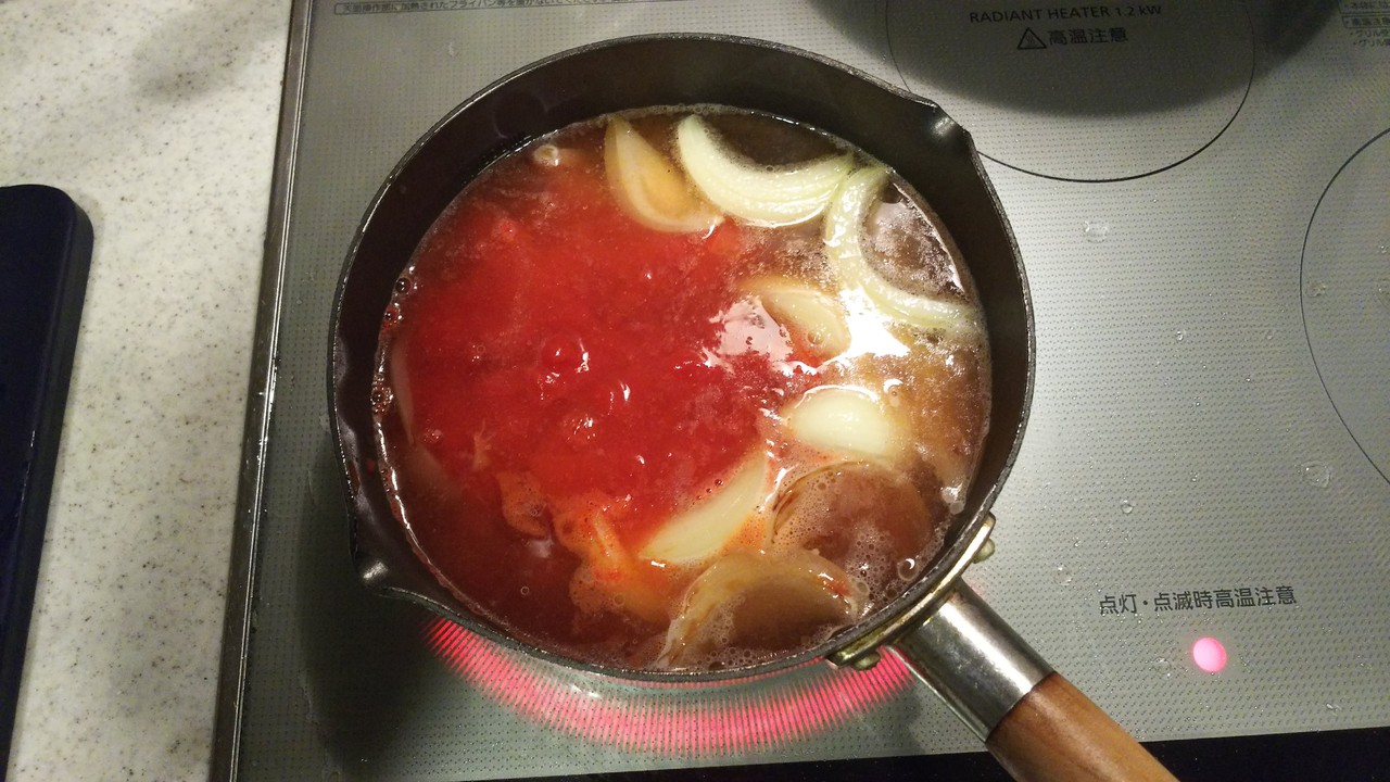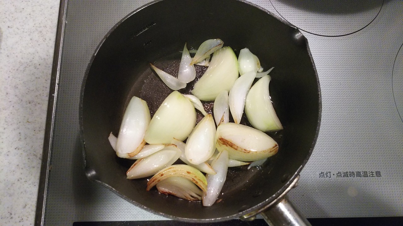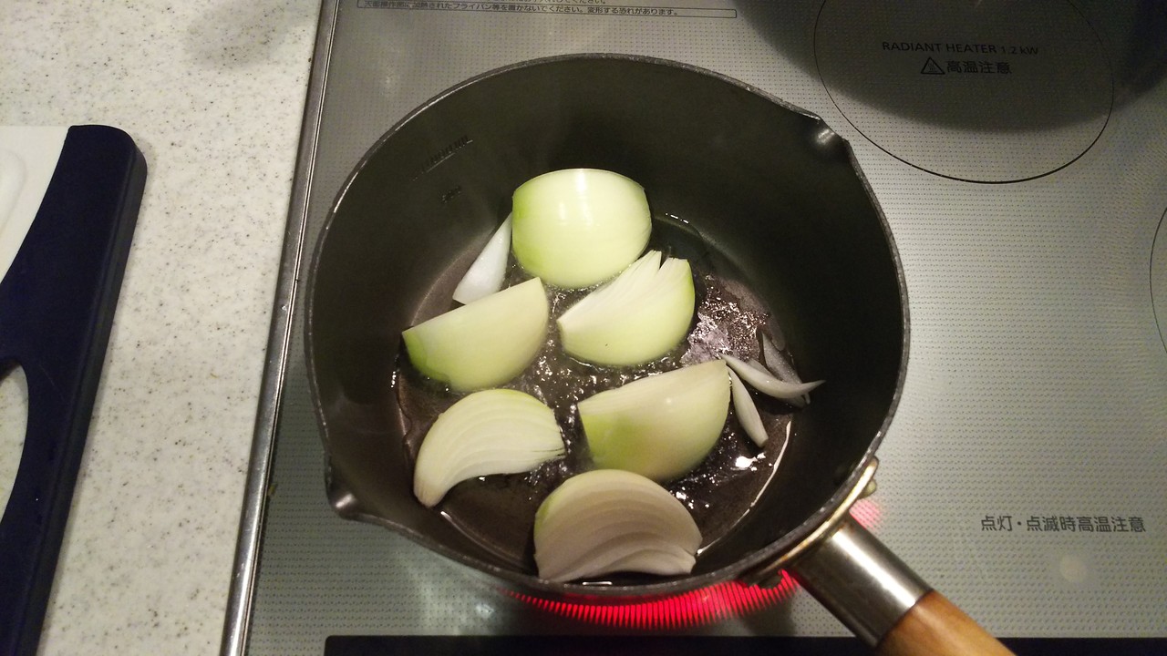 2.鍋にオリーブオイル(大さじ2)を入れてタマネギを入れます