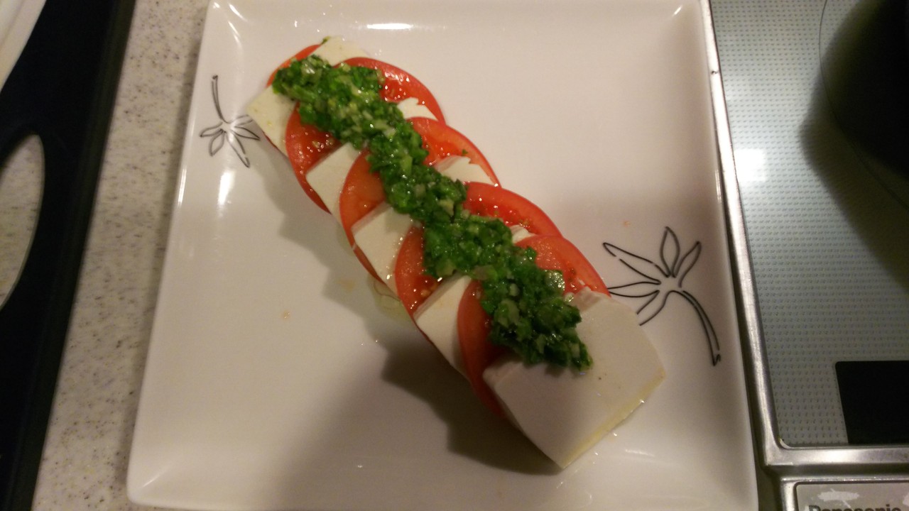 2.絹こし豆腐、トマト(200グラム)はそれぞれ1センチ幅に切っておきます