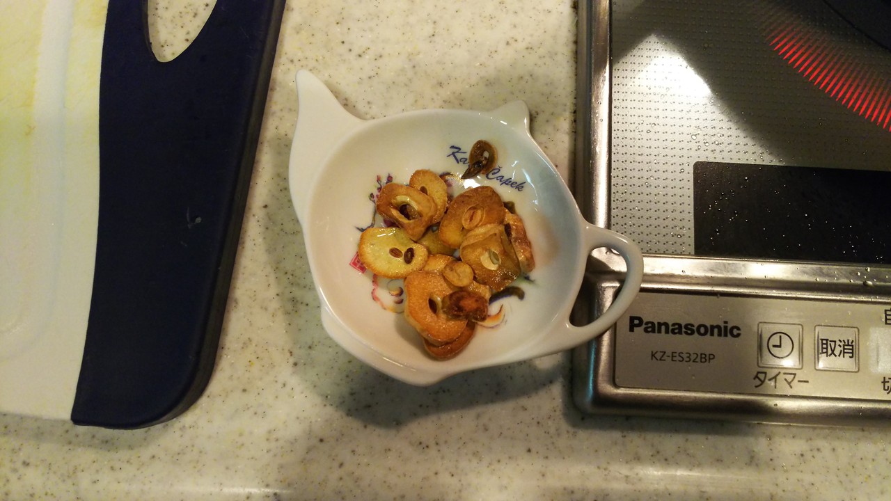 3.ニンニクがカリっとなったら引き上げておきます