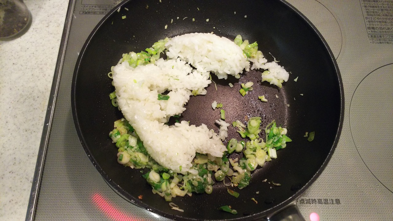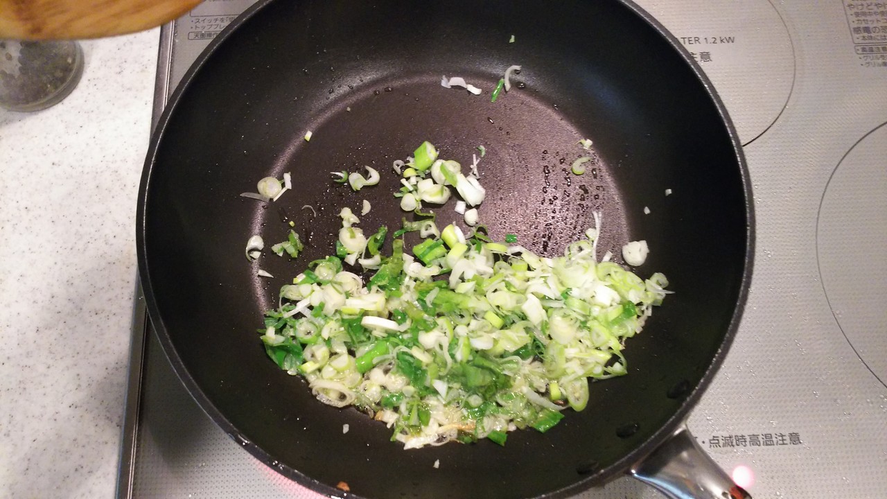 4.フライパンに残った油に白ネギを入れて炒めます