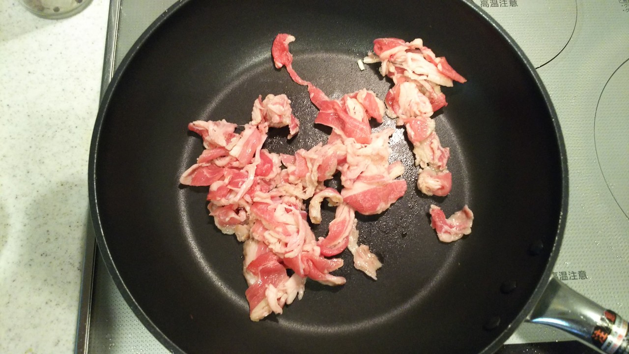 7.フライパンを拭きとって牛肉切り落としを入れます