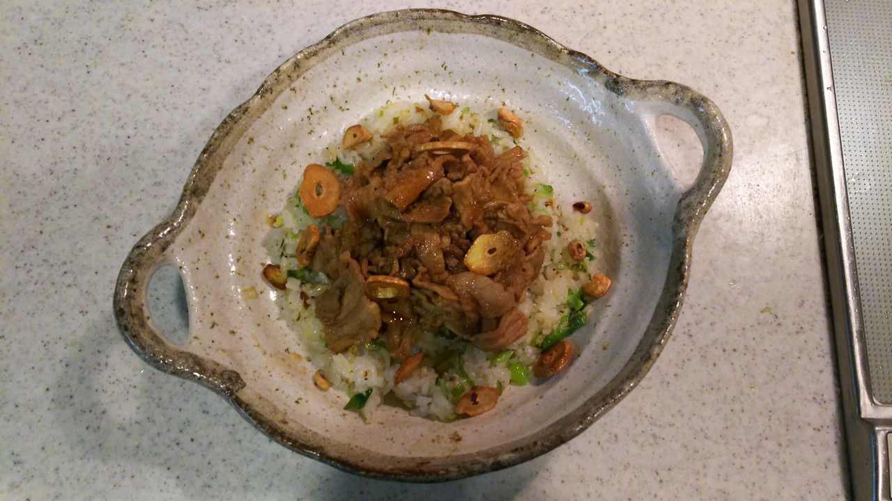 9.ご飯の上に牛肉をのせてニンニクを散らせば出来上がり