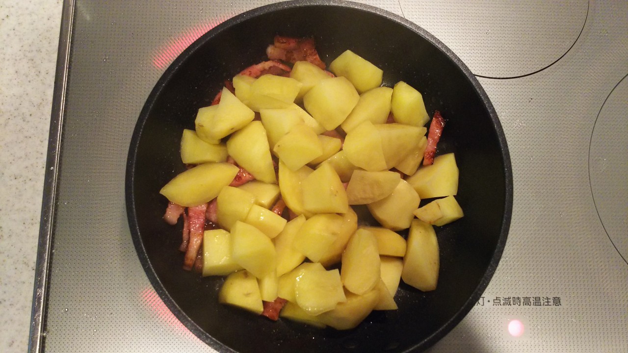 2.フライパンにベーコンを入れて焦げ目がつくまで焼いておきます