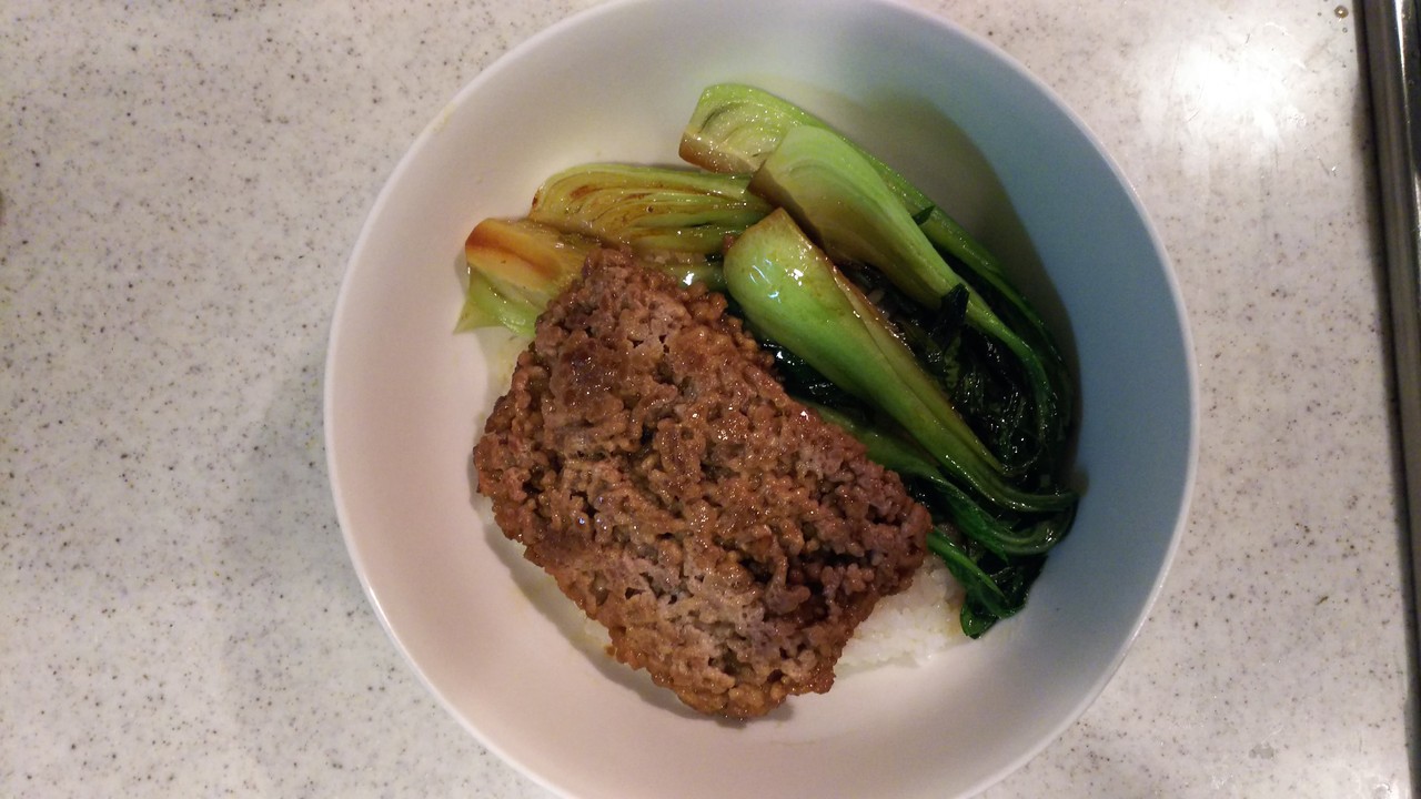 器にご飯(300グラム)盛ってチンゲン菜、豚ひき肉をのせて出来上がり