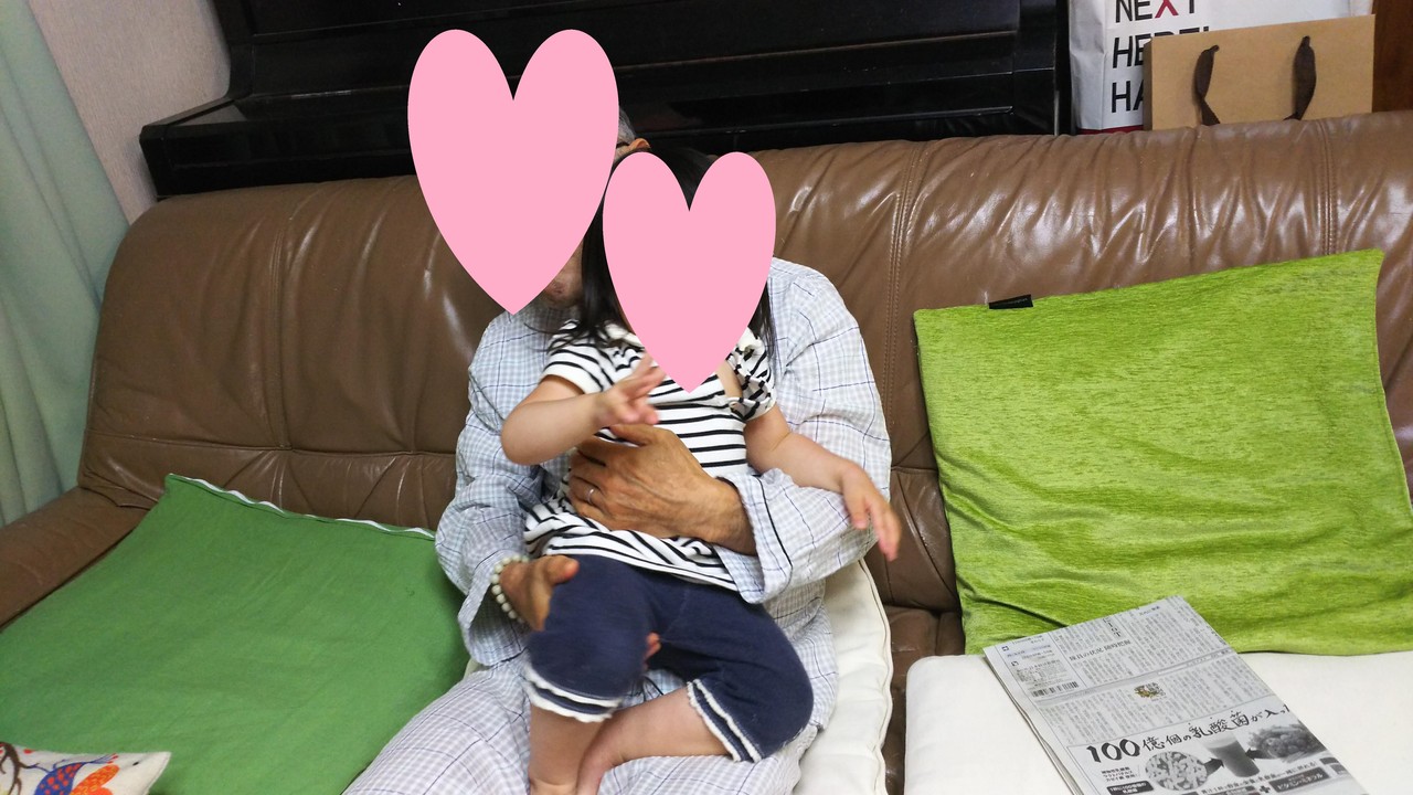 おじいちゃんに抱っこされても、ご機嫌ちゃんです