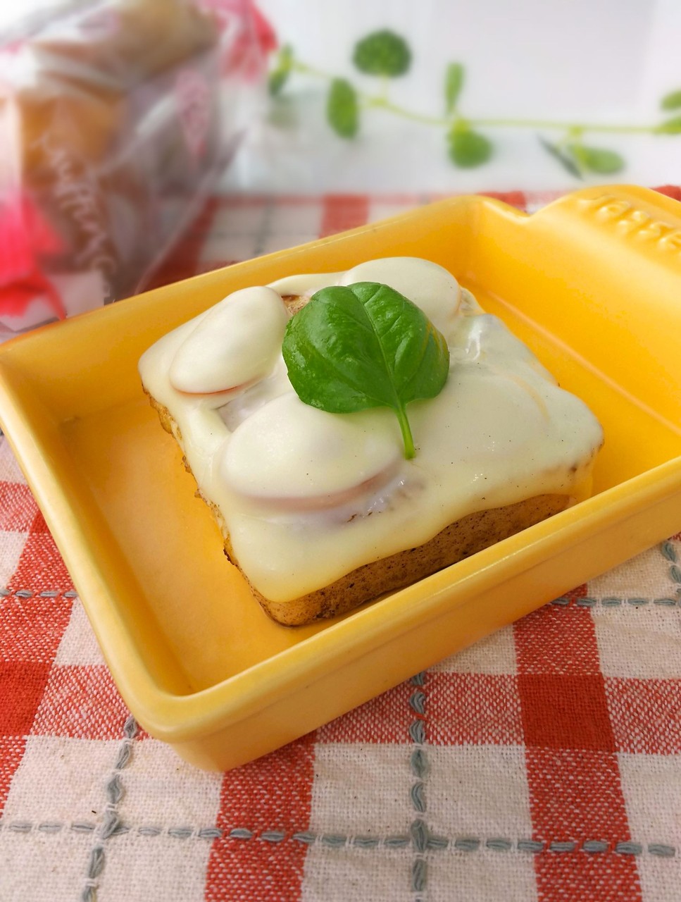 上にトマト、チーズをのせて焼いてからバジルをのせる