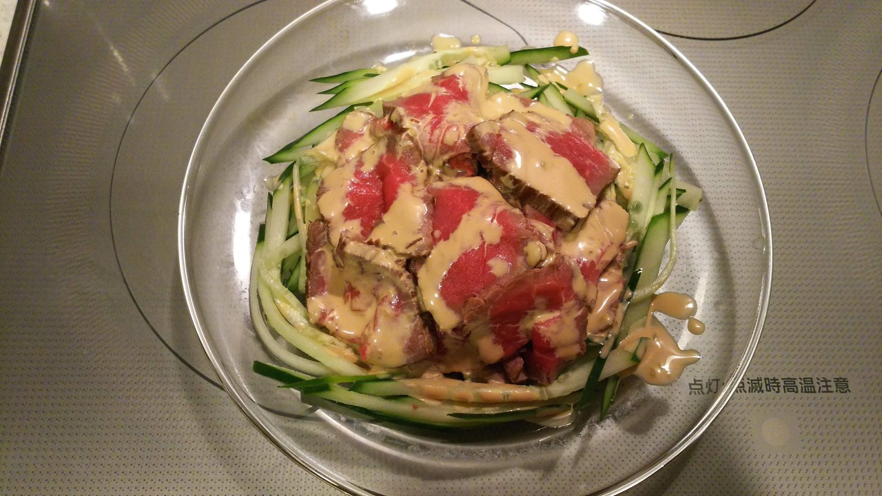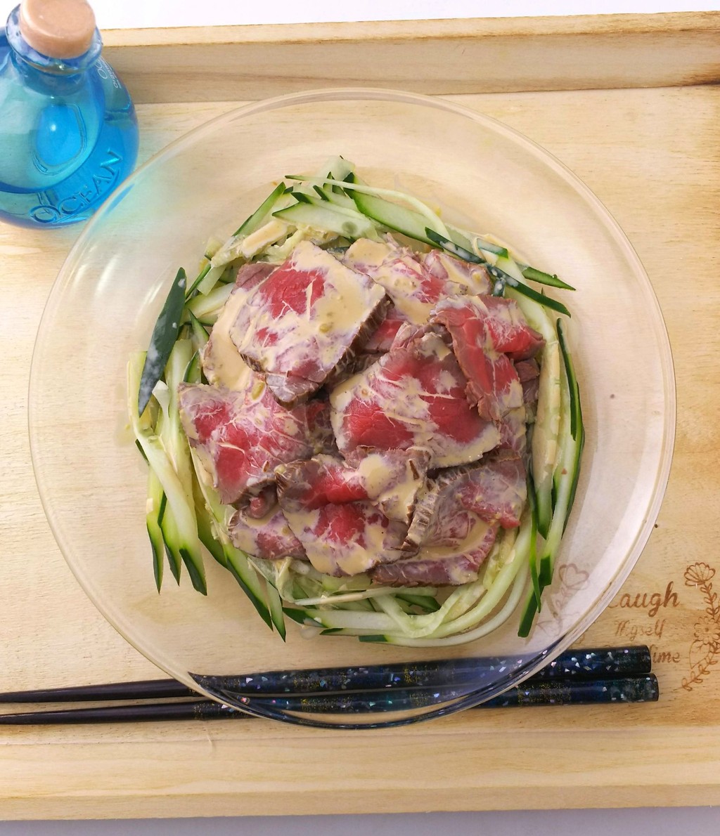 7.お皿に細切りにしたキュウリ(150グラム)をのせて上に牛肉をのせます