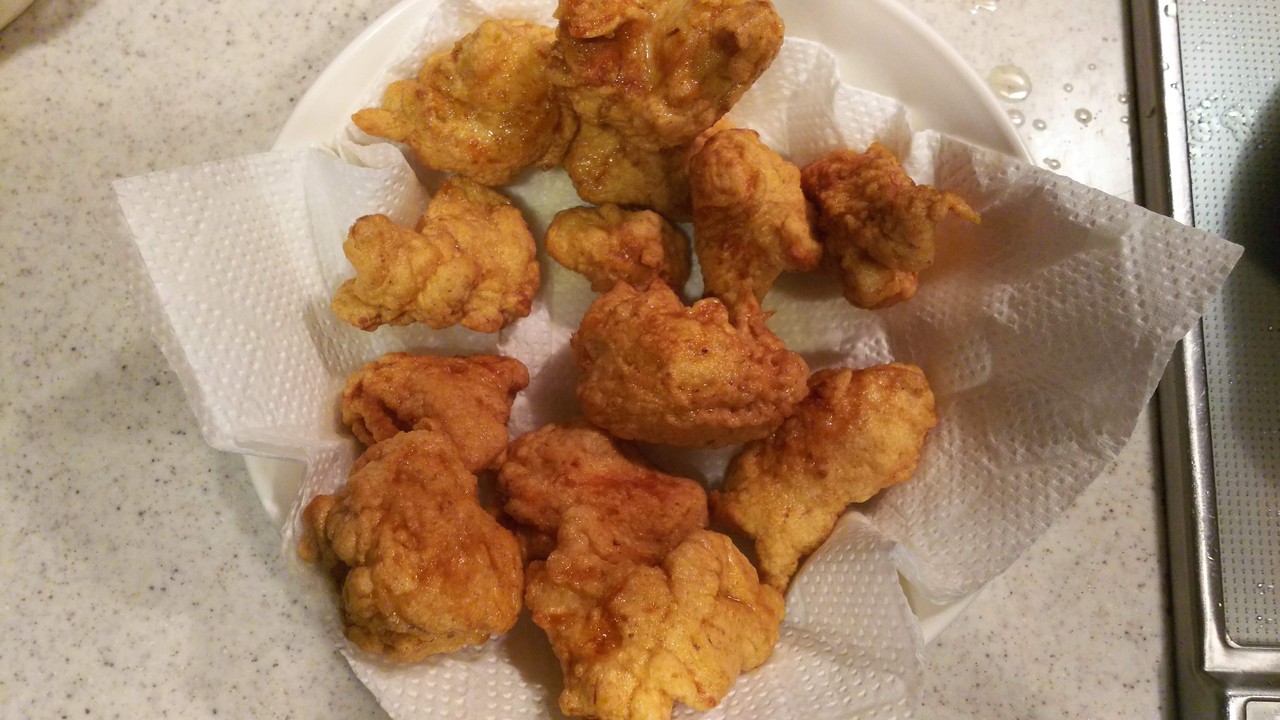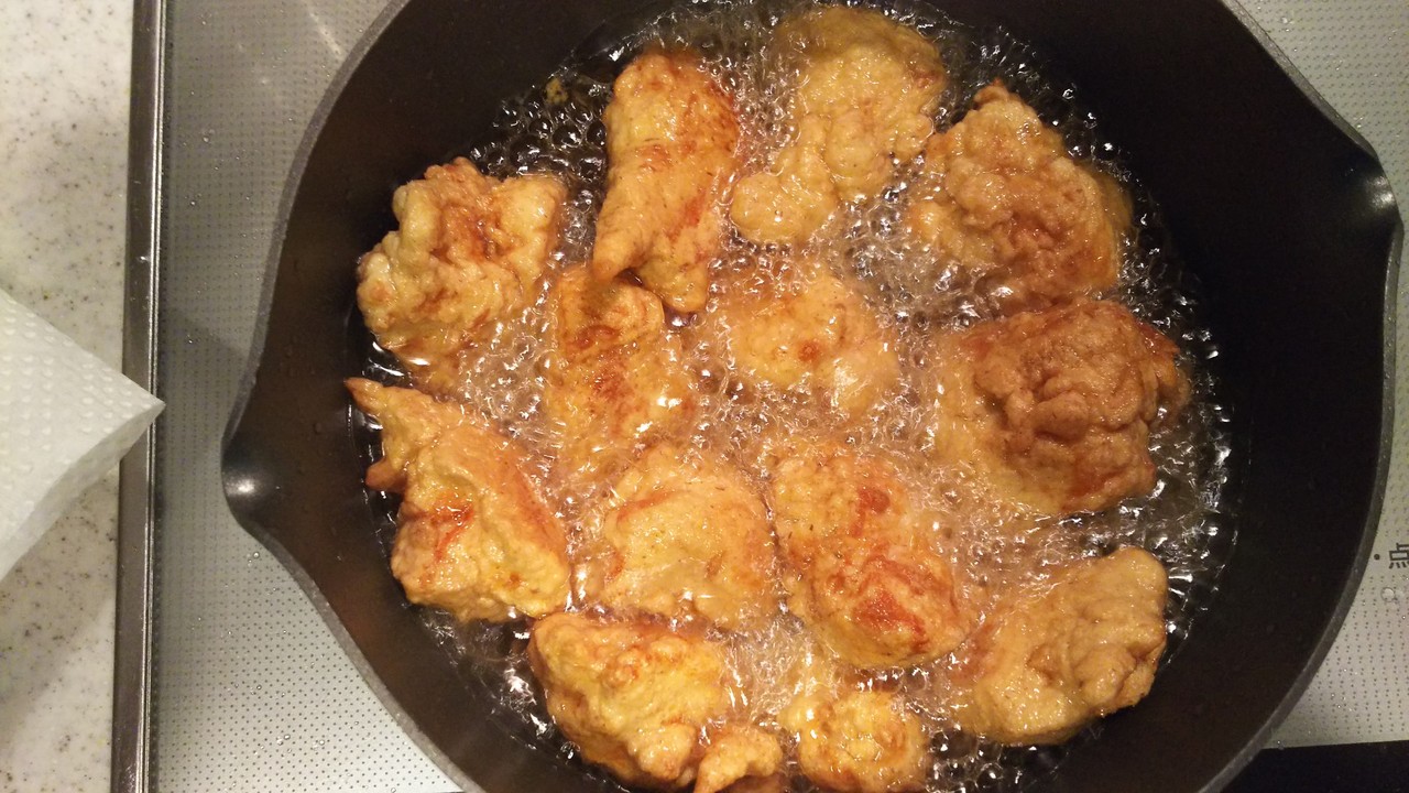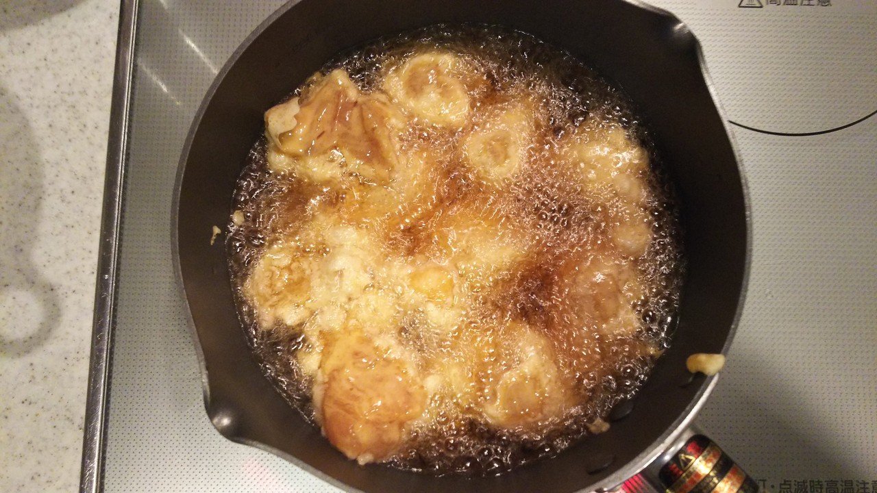 玉子を入れて片栗粉や小麦粉でしっかりとした衣を作ったので