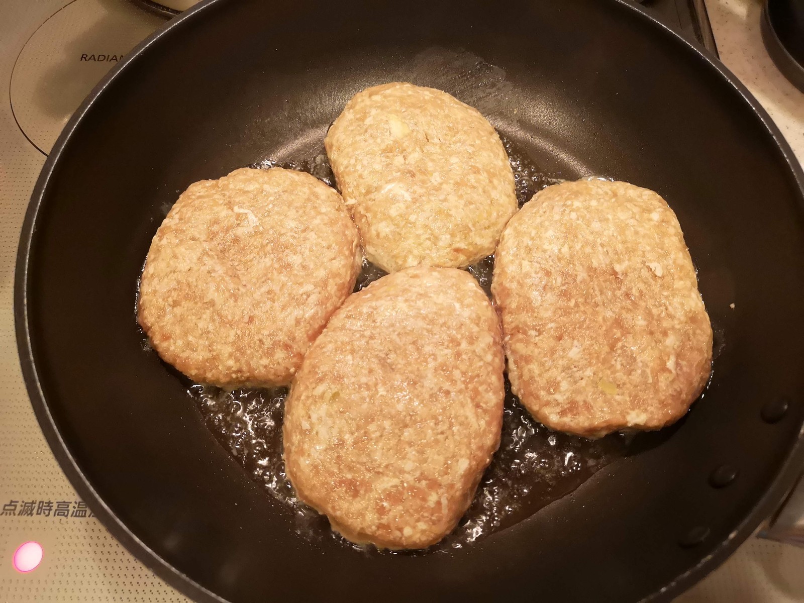 9.フライパンにサラダ油(小さじ1)をひいて挽き肉入れて蓋をして5分焼きます