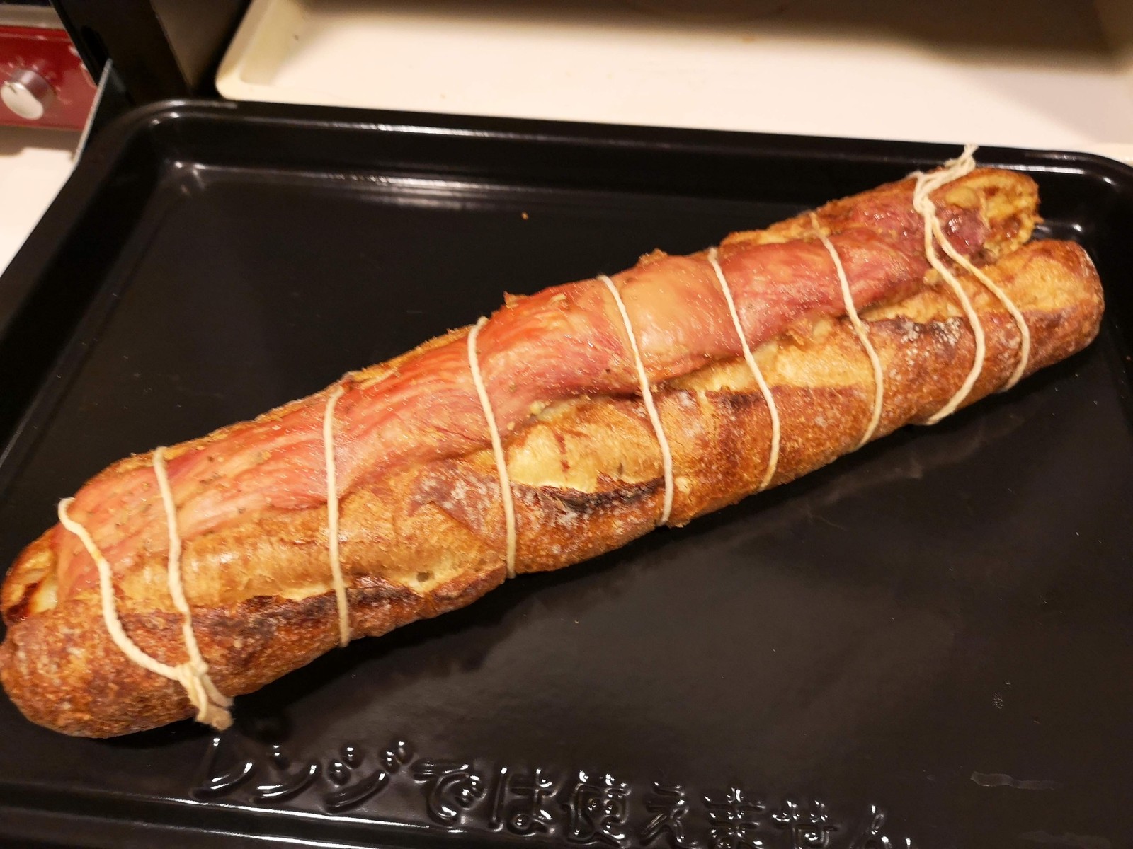 3.バケットに豚ヒレ肉を挟んでタコ糸で絞ります
