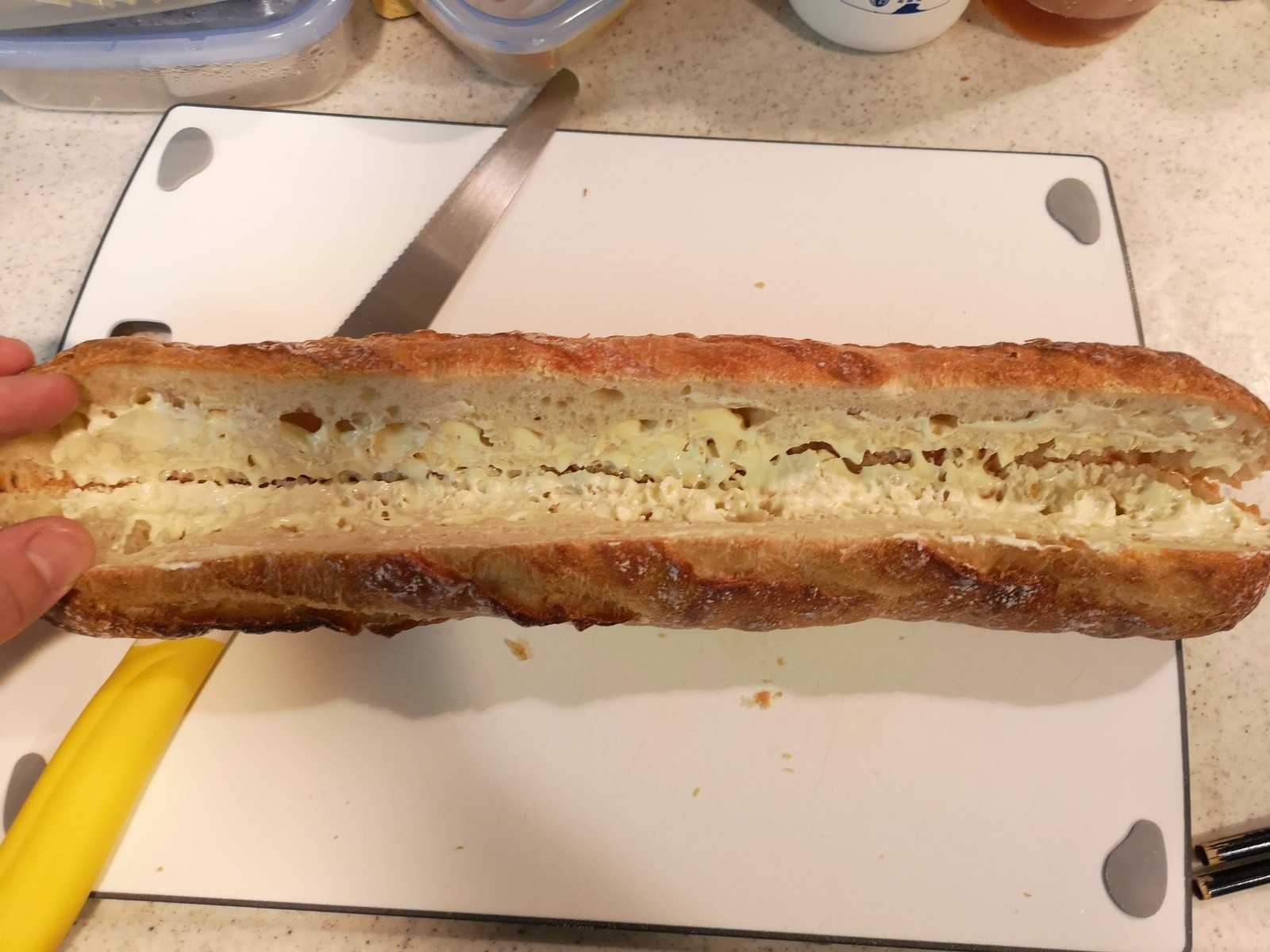 1.バケット(1本)は真ん中に切り込みを入れて開きマヨネーズ(大さじ2)を塗ります