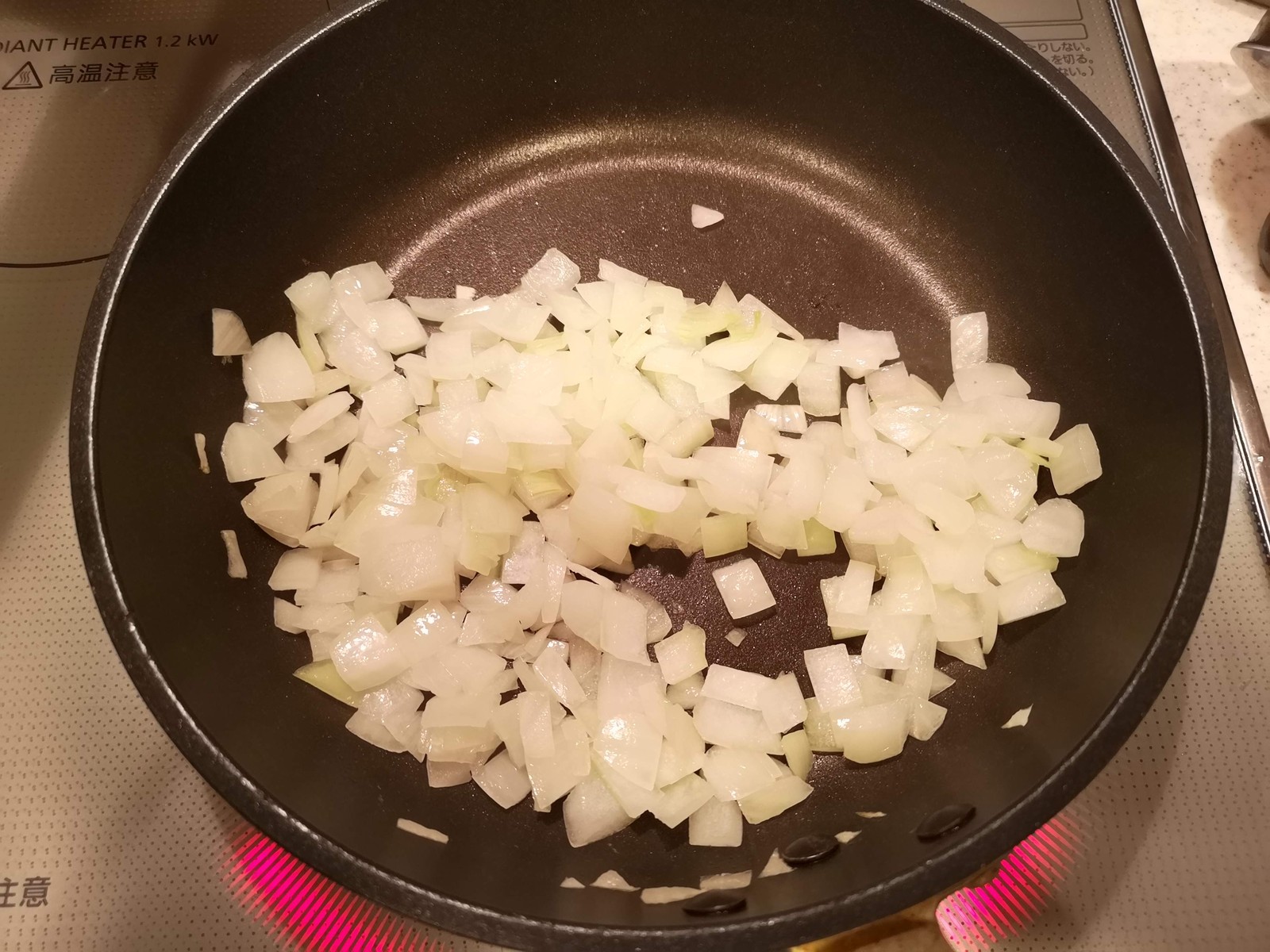 2.タマネギ(100グラム)を1センチ角に切ってフライパンで透き通るまで炒めます