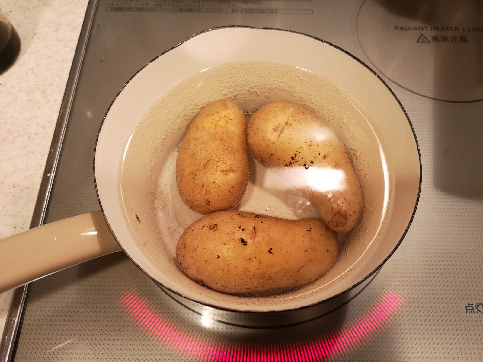 1.鍋に水を入れてジャガイモ(250グラム)を20分ほど茹でて柔らかくします