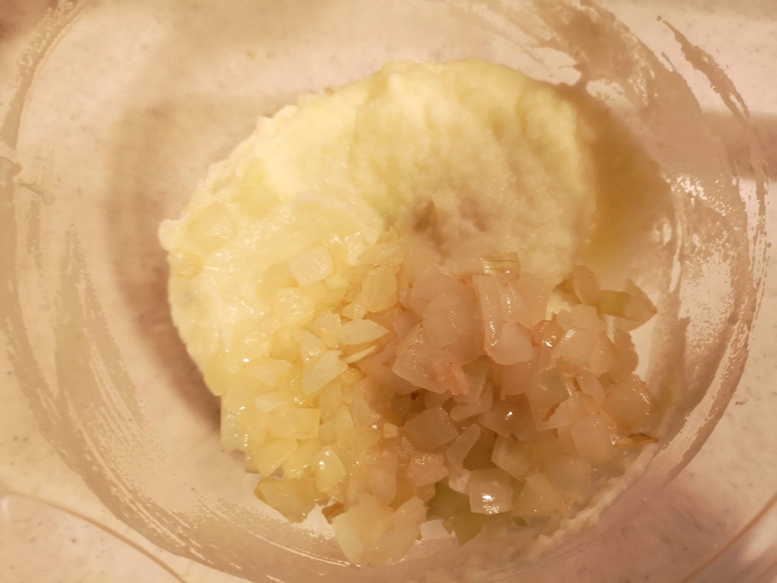 5.しっかりと混ぜたら炒めたタマネギを加えてさらにしっかりと混ぜます