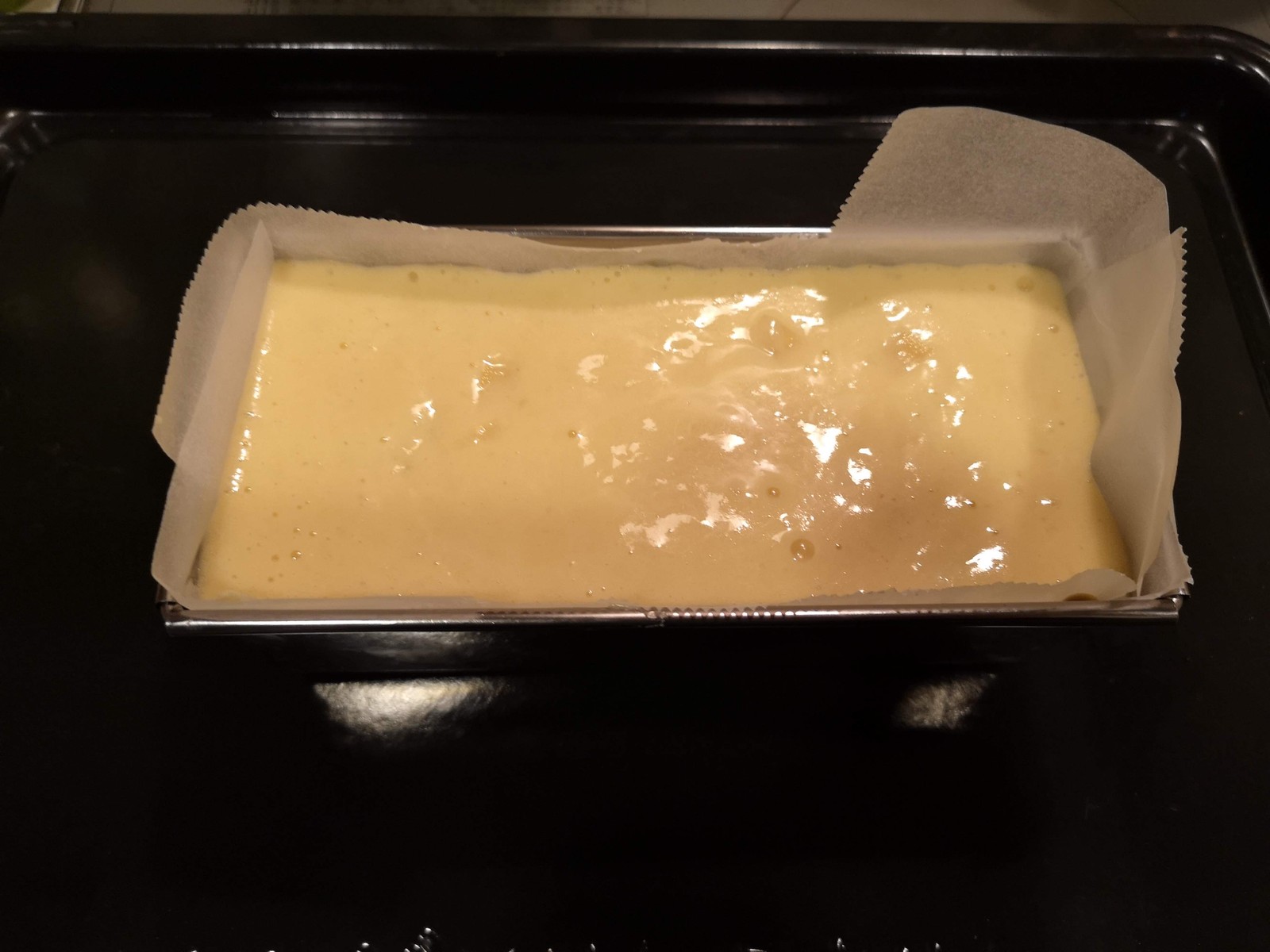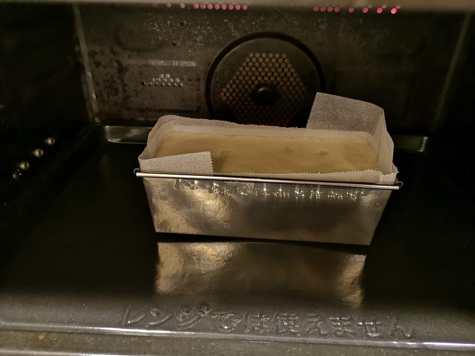 10.パウンドケーキ型にクッキングシートを敷いて生地を流し入れます