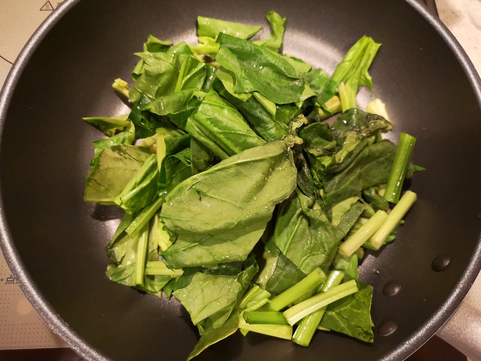 2.フライパンにオリーブオイル(大さじ1)、ほうれん草を入れて炒めます