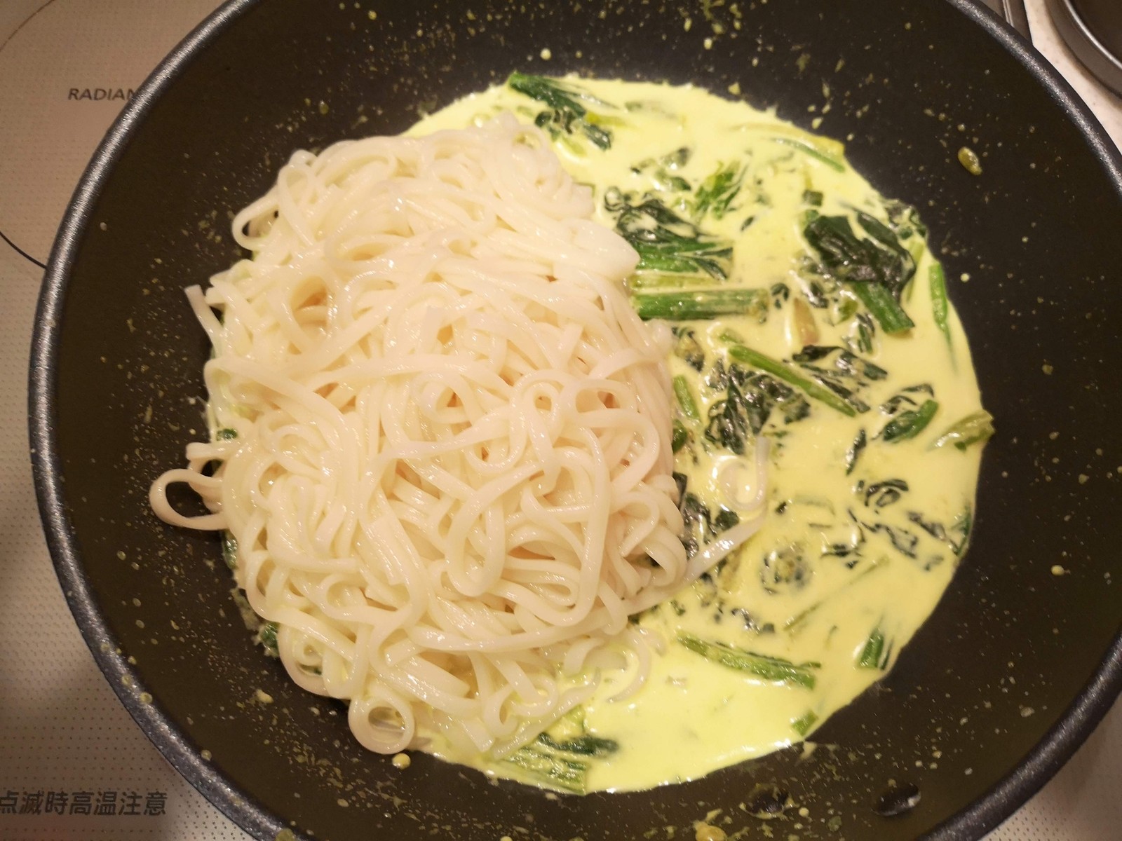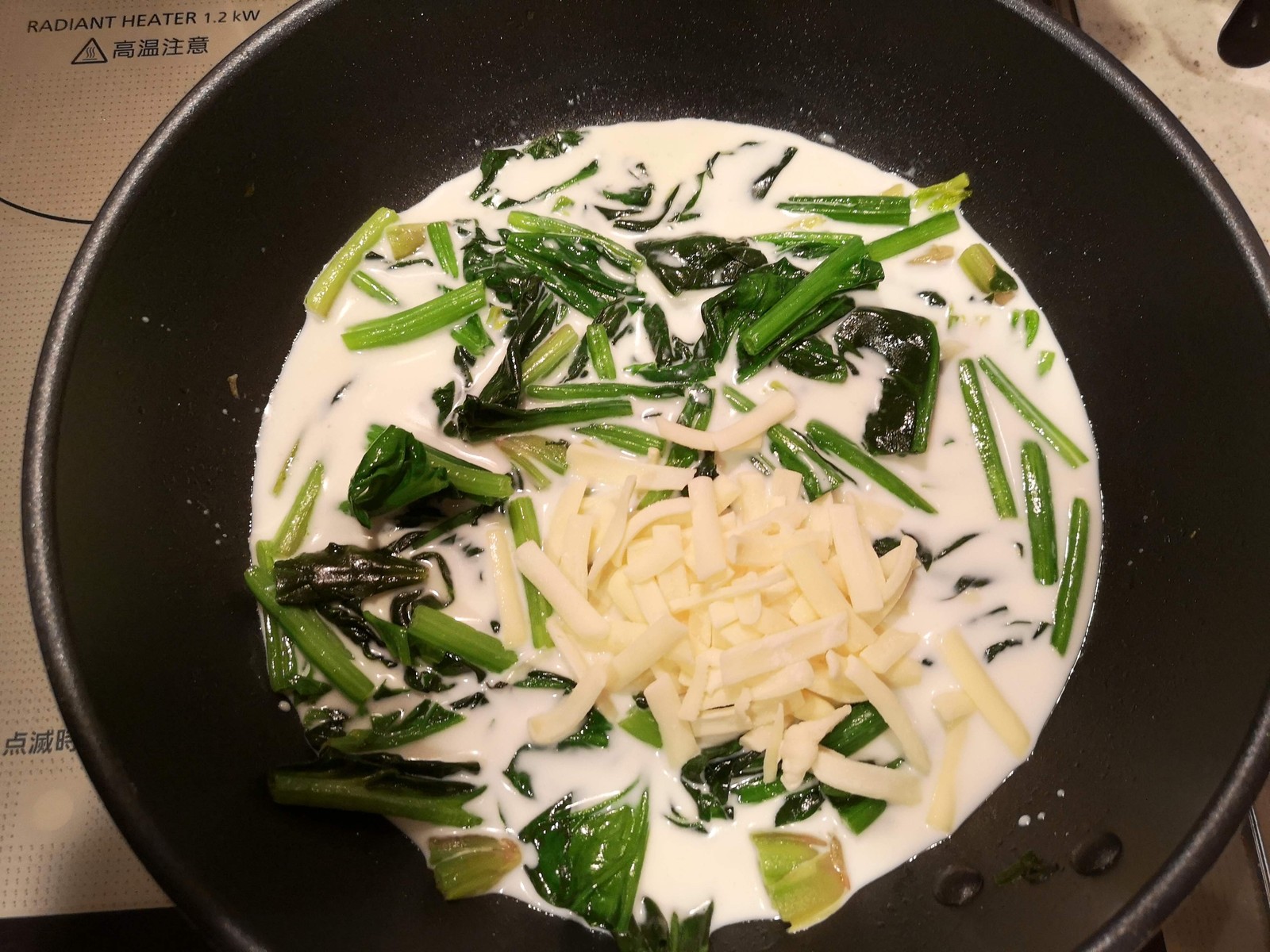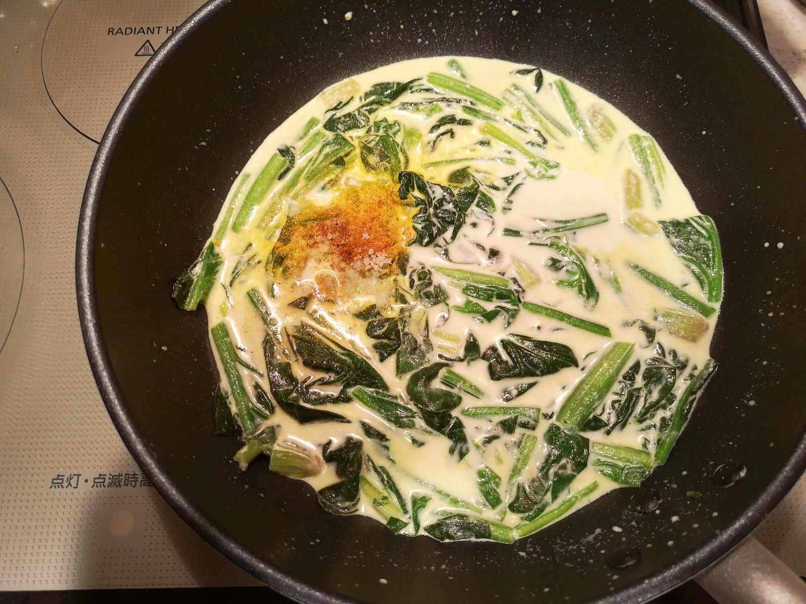 3.ほうれん草がしんなりしたらピザ用チーズ(30グラム)、牛乳(200ml)を加えて弱火で温めます