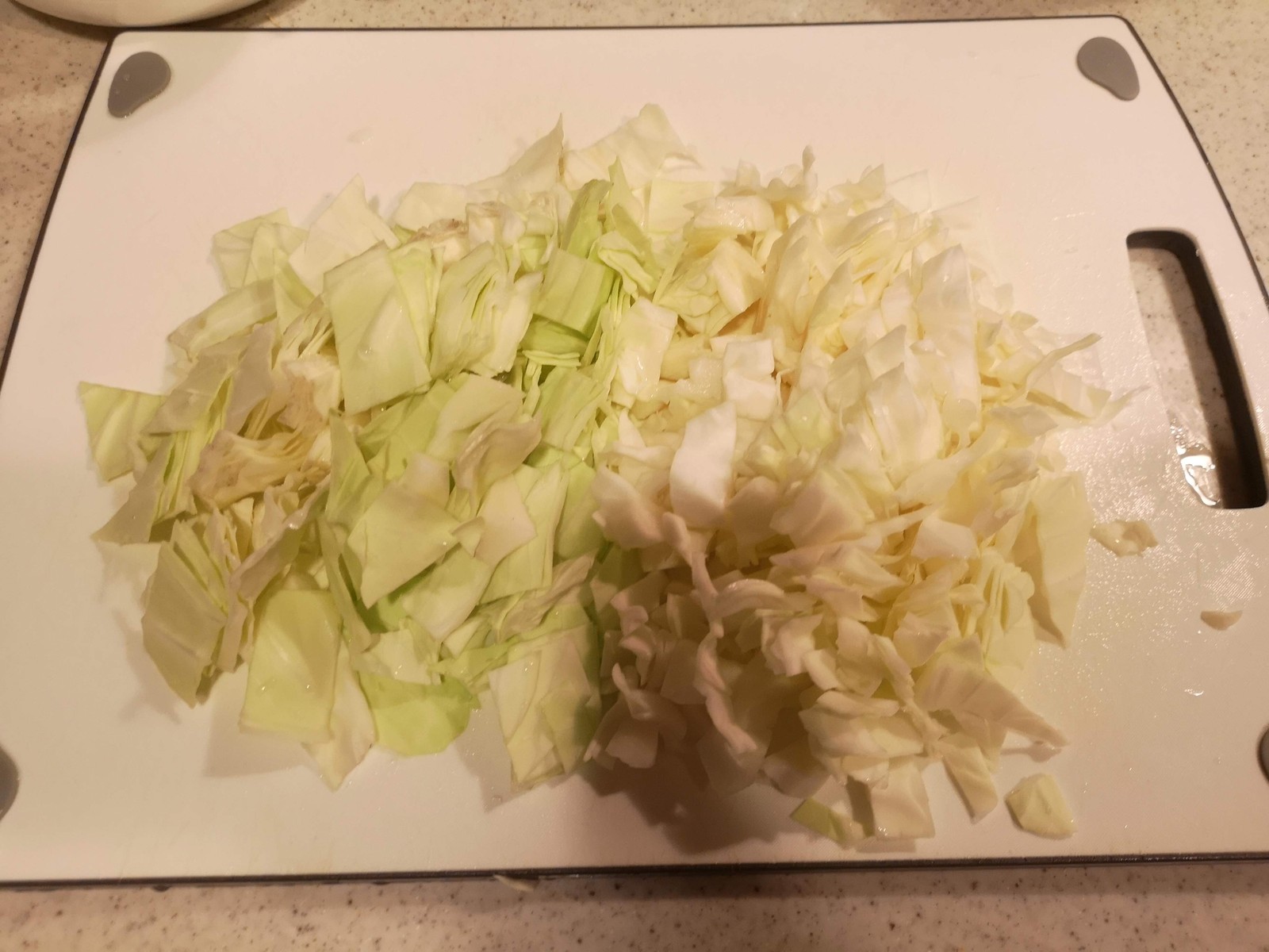 1.キャベツ(350グラム)は2~3センチ角に切っておきます