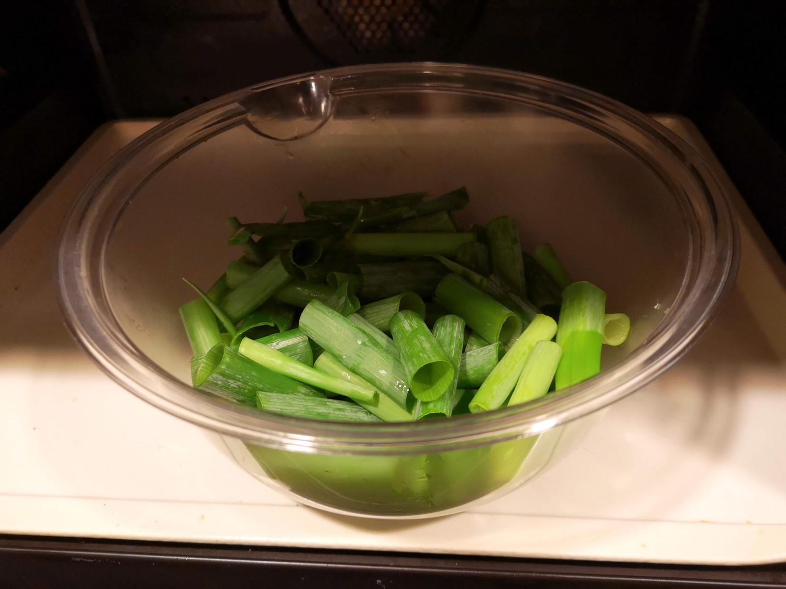 2.耐熱用の器に青ネギを入れて600Wで1分レンジにかけます