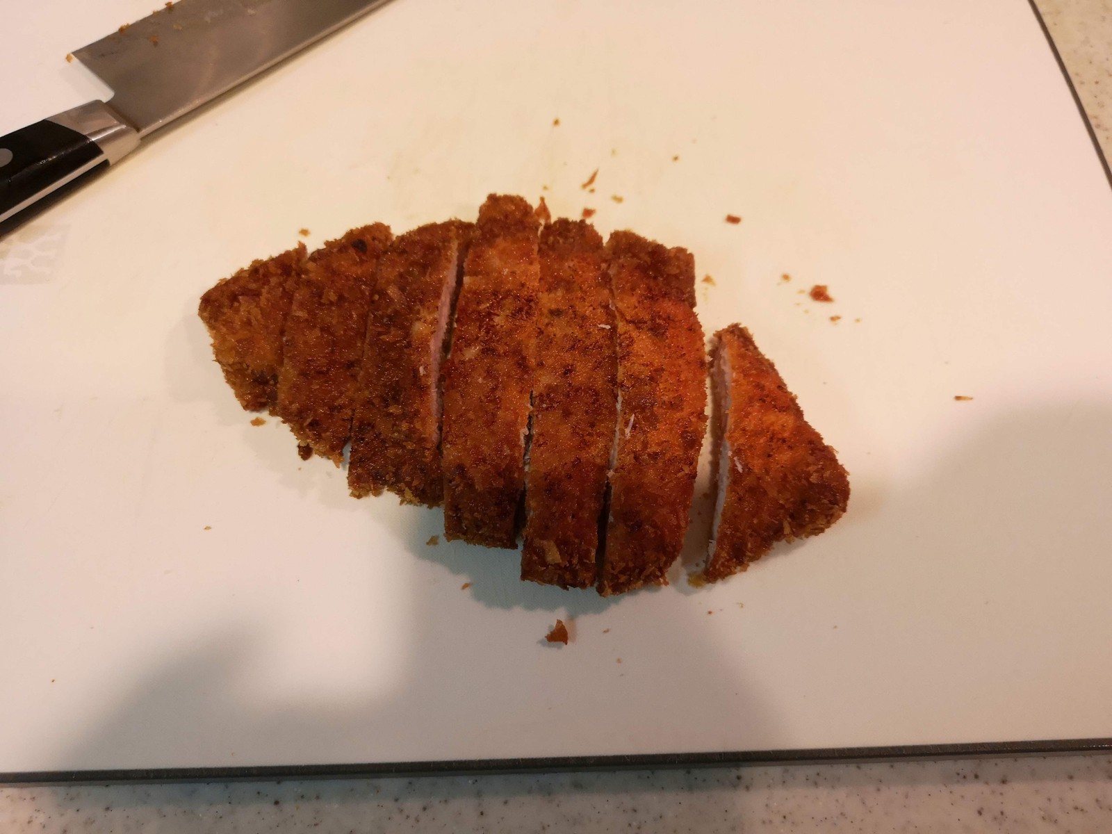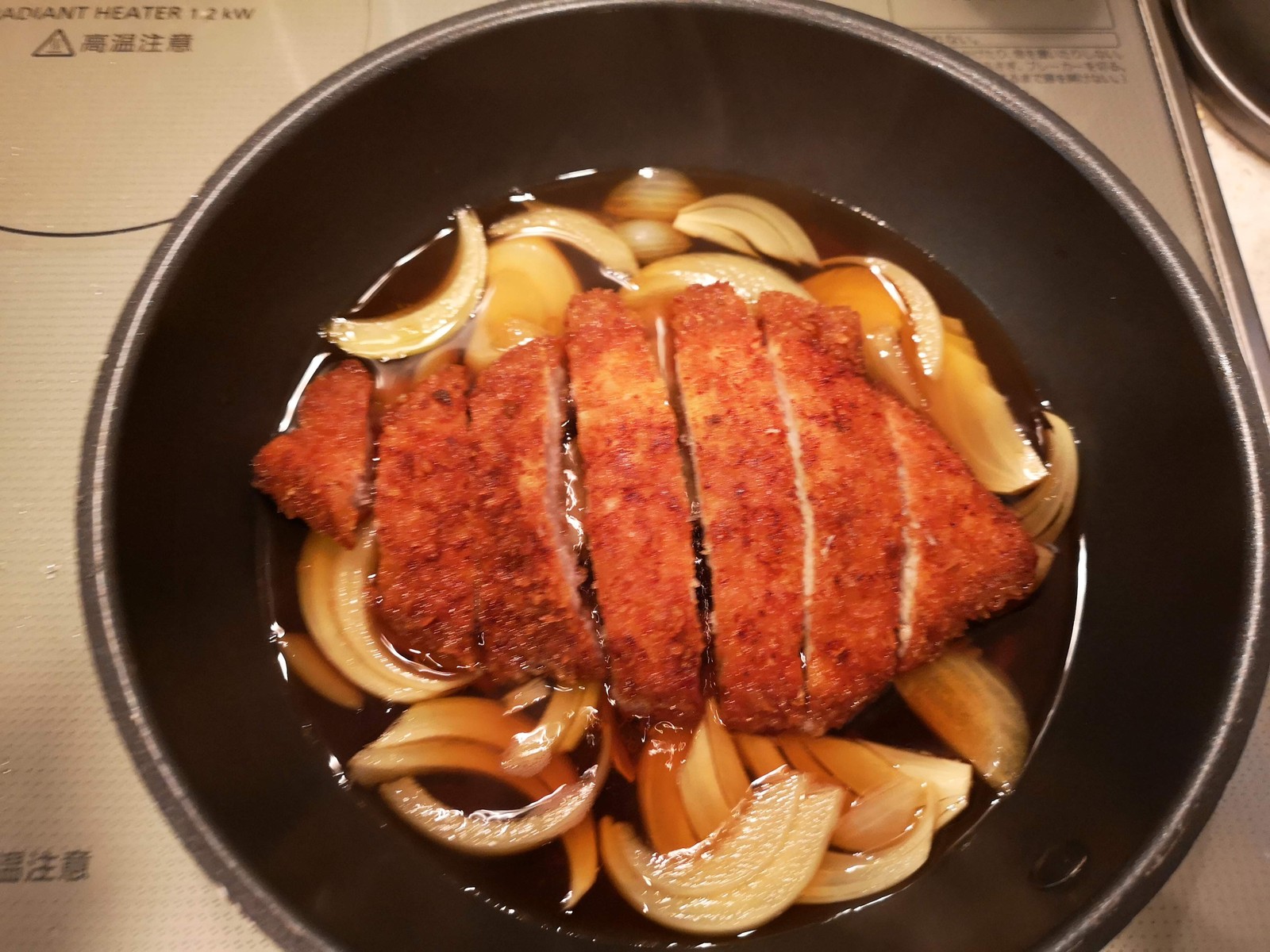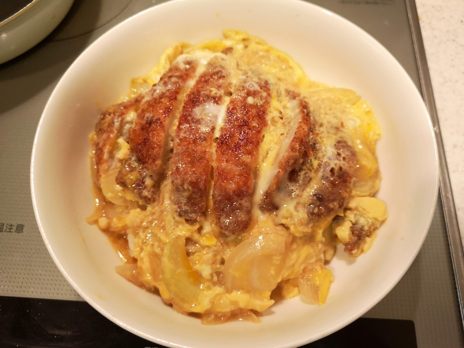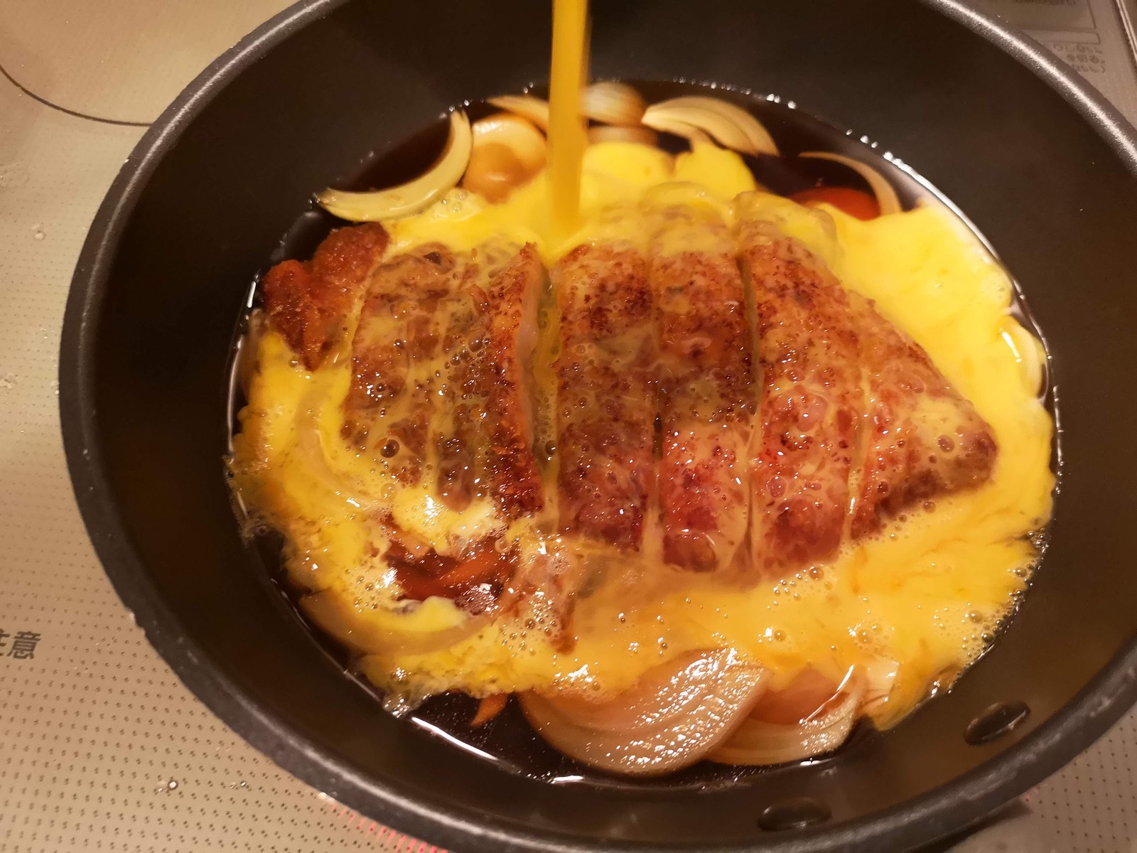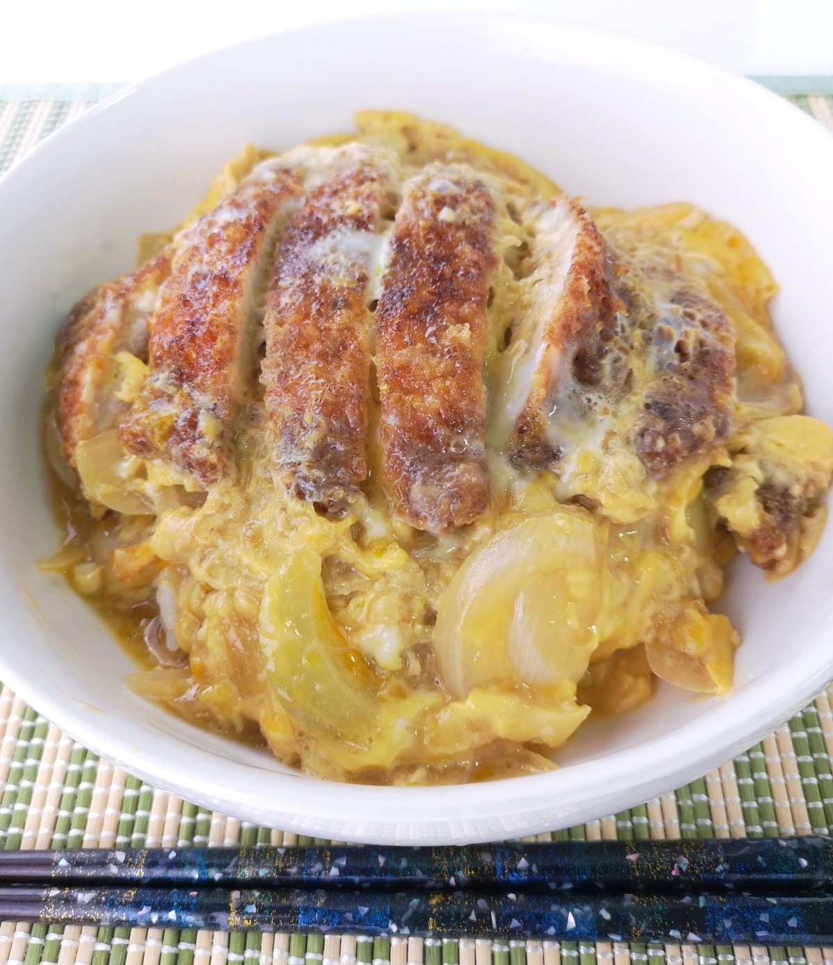 12.器にご飯(300グラム)を盛って上に玉子でとじたトンカツをのせたら出来上がり