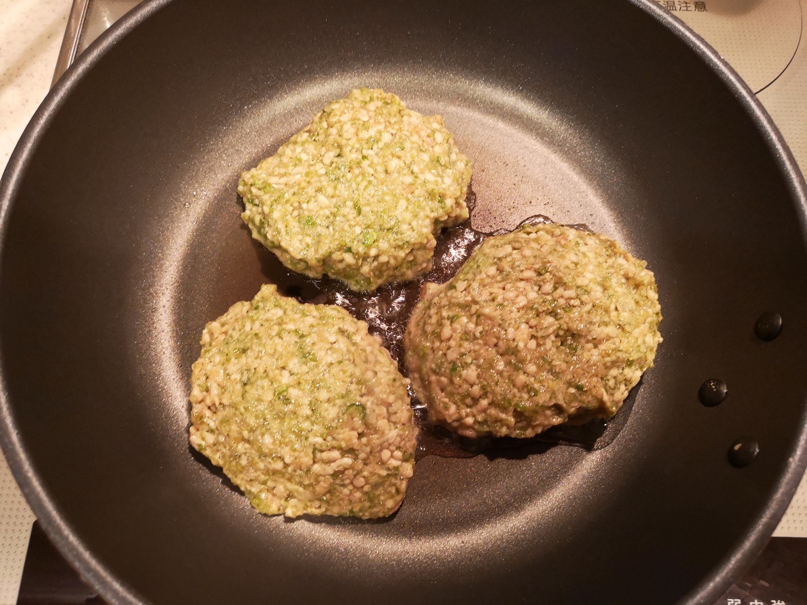 6.フライパンにサラダ油をひいて丸く整えた挽き肉を焼きます