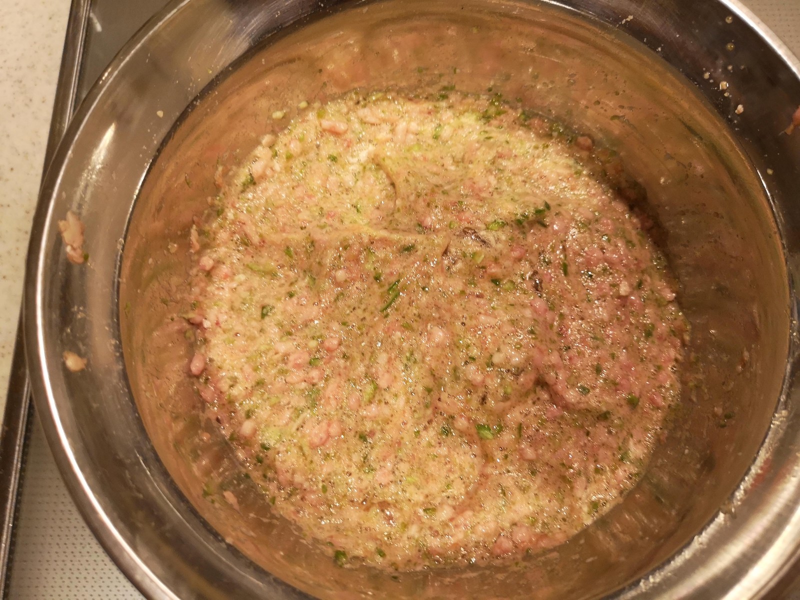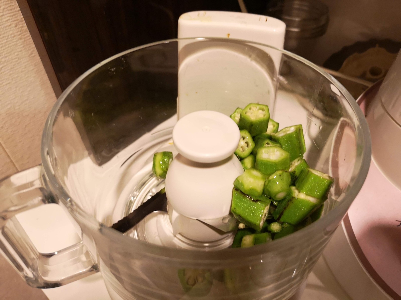 オクラをフードプロセッサーで細かくしてから挽き肉と混ぜます