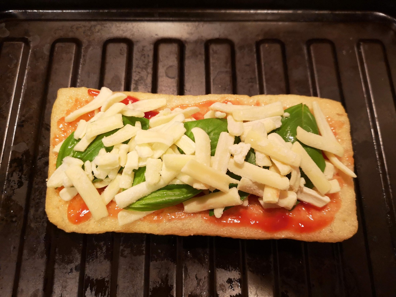2.上にピザ用チーズの半量(10グラム)とバジル(3~4枚)をのせます
