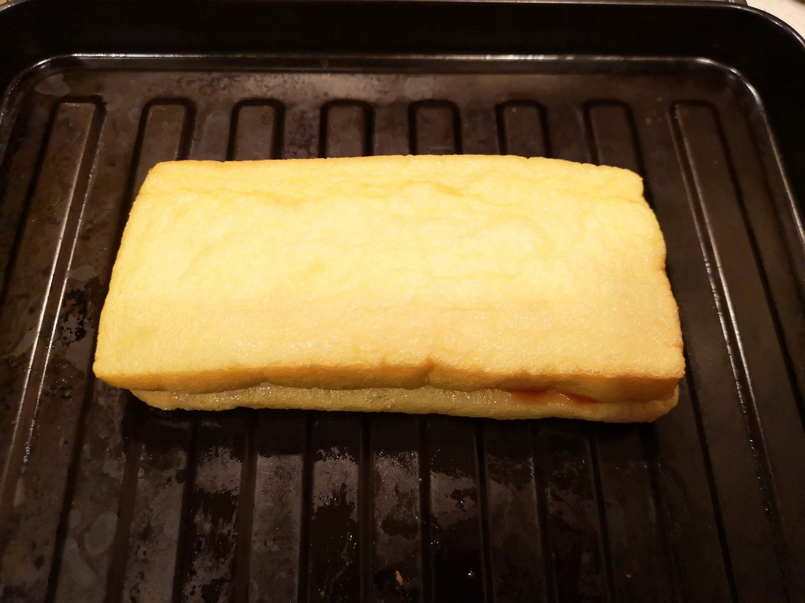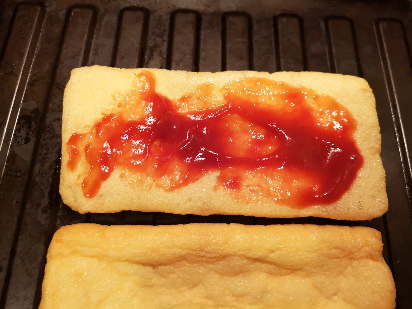 1.油揚げの一枚にトマトケチャップ(大さじ1)を塗ります