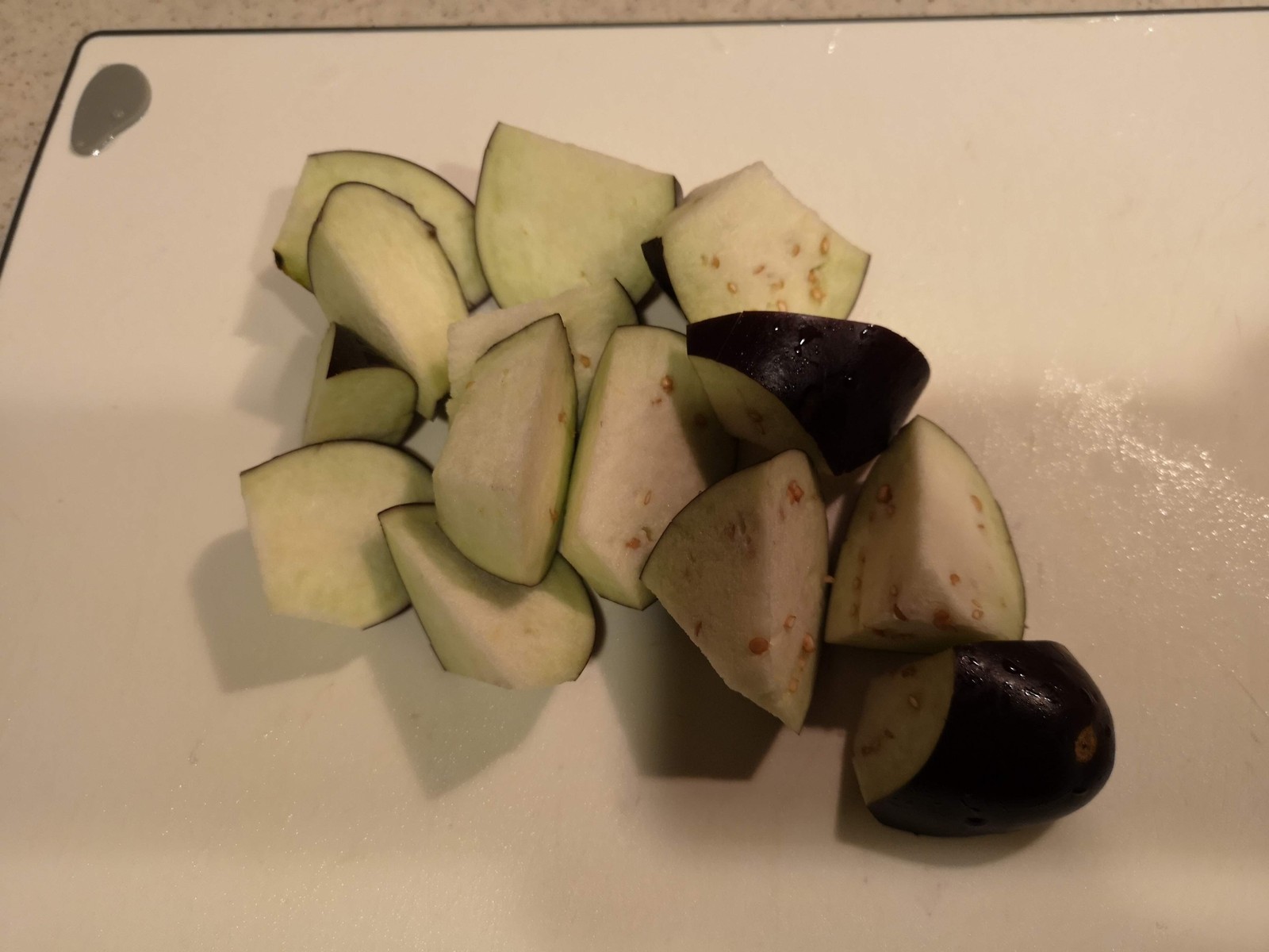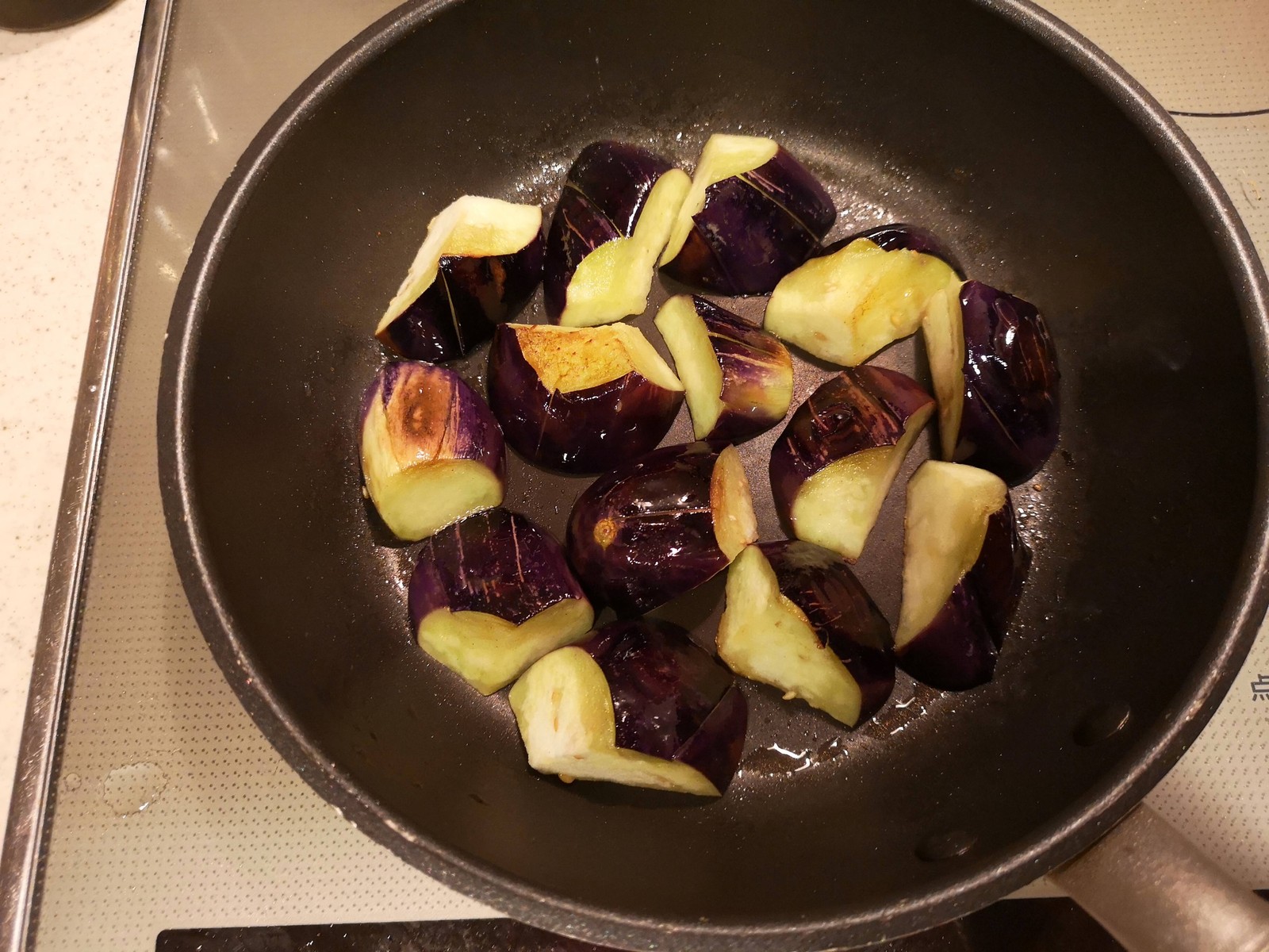 1.ナス(150グラム)は皮に切り目を入れて乱切りにします