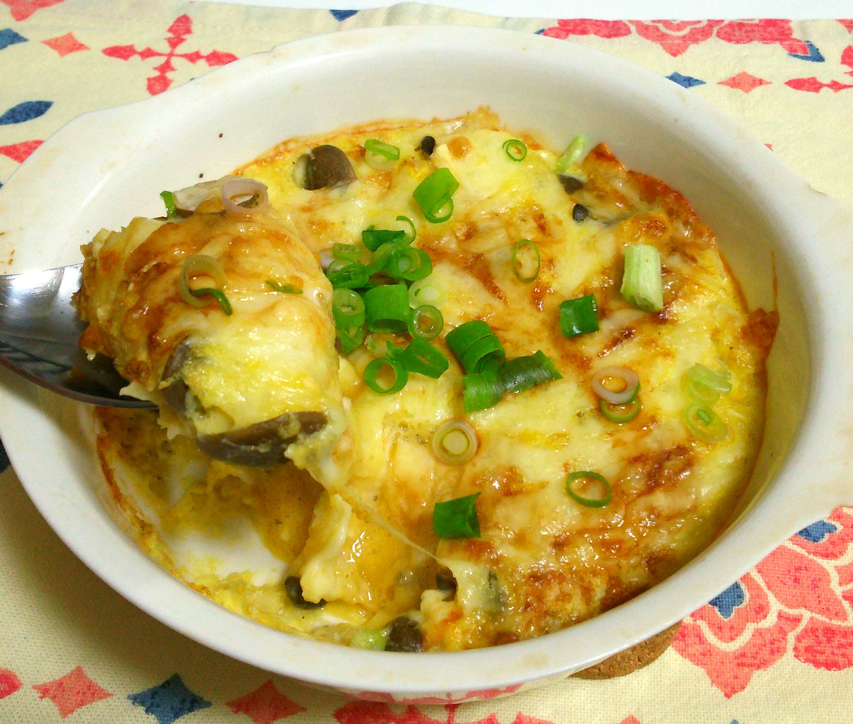 4.チーズに焦げ目がついたら取り出した刻みネギ(適量)とポン酢(小さじ2)をかけたら出来上がり