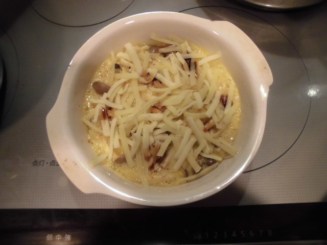 3.焼いたらピザ用チーズ(30グラム)をのせて醤油(少々)を全体にたらして再度焼きます