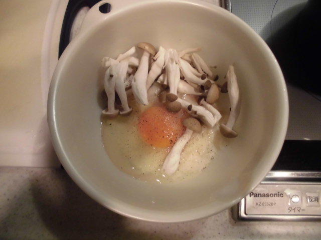 1.ボールに摩り下ろした長いも(100グラム)、玉子(1個)、ばらしたシメジ(50グラム)、塩(小さじ1/4)を入れて混ぜます