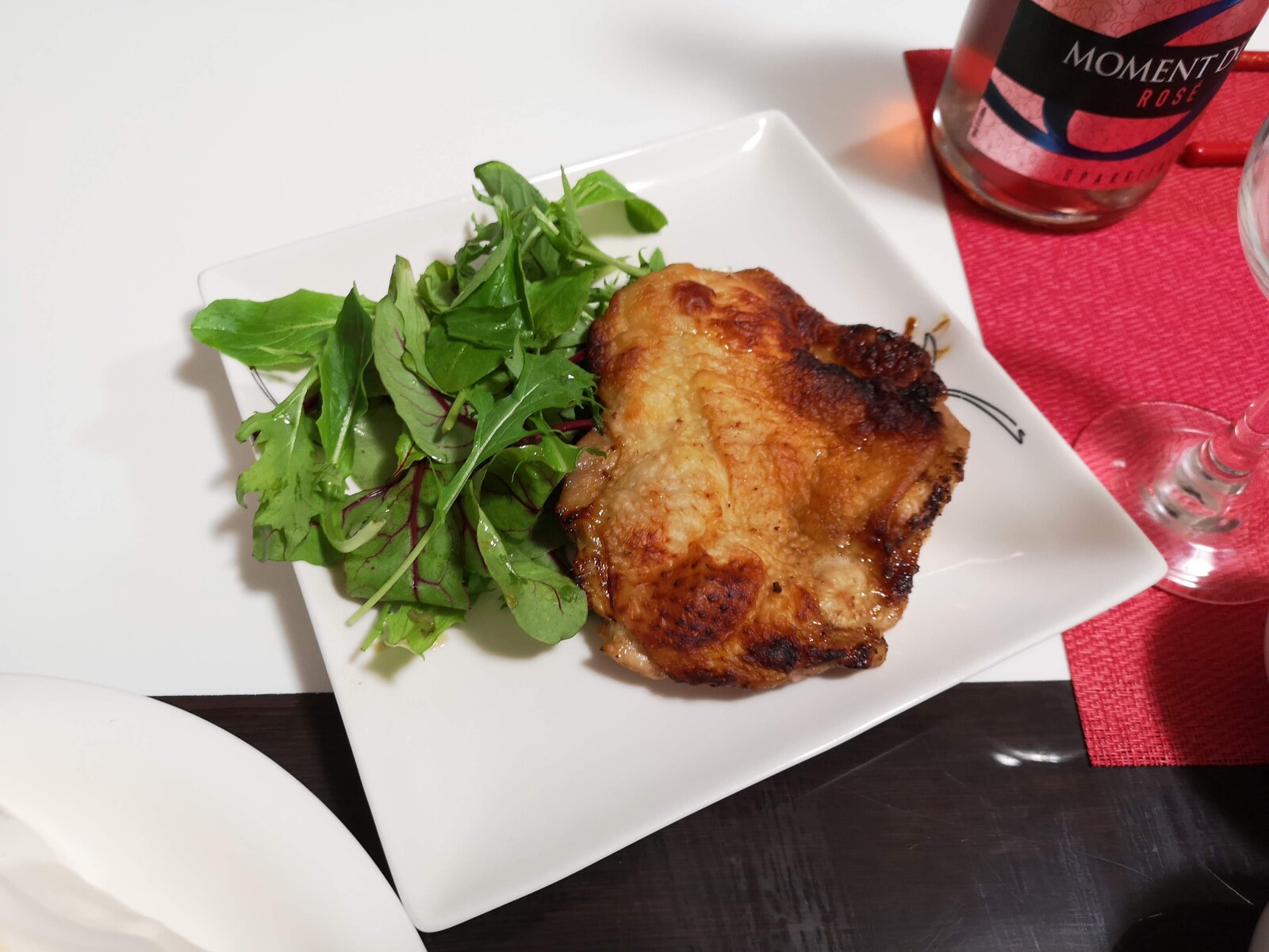 ショウガ、醤油、酒、みりんで味付けをした鶏もも肉をオーブンで焼きました