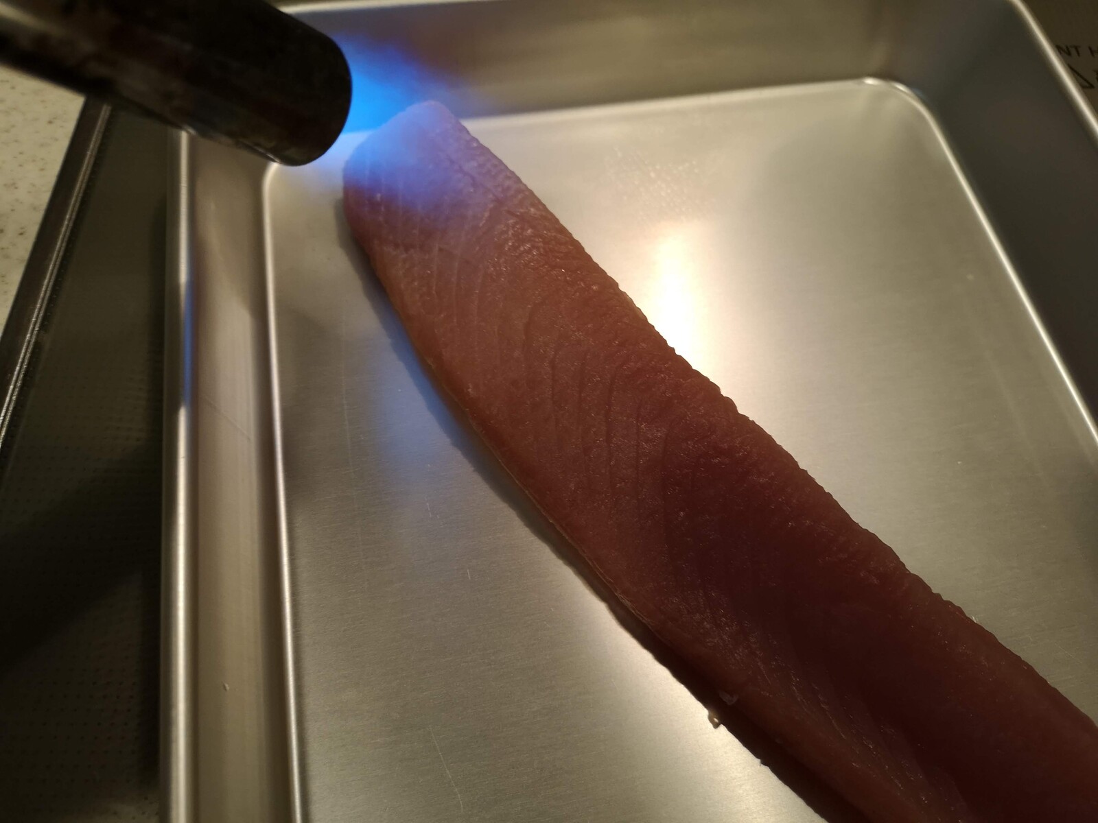 2.ビンチョウマグロ(200グラム)の表面をバーナーで炙ります