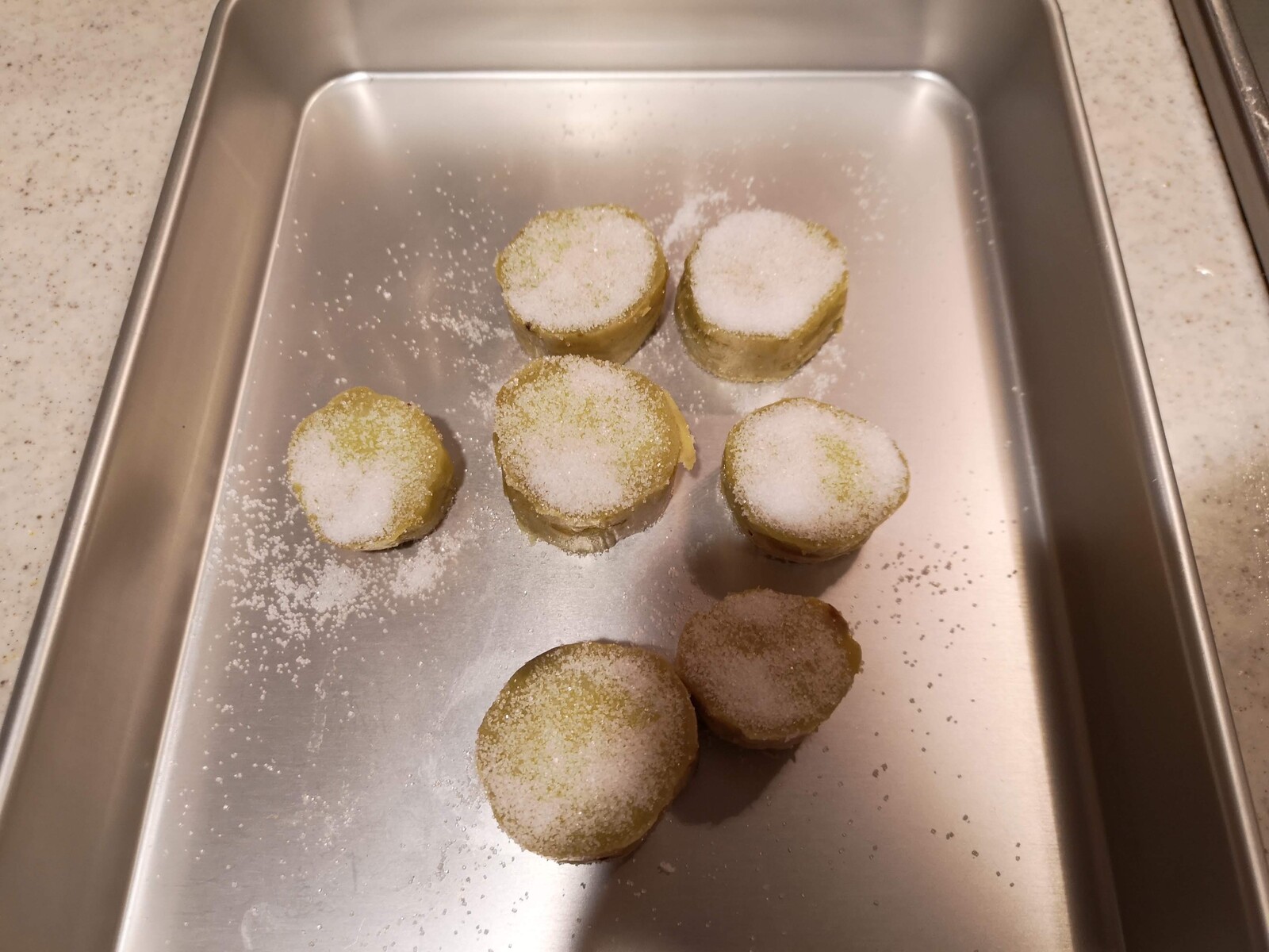 4.切ったら表面にグラニュー糖(小さじ2)をまぶします