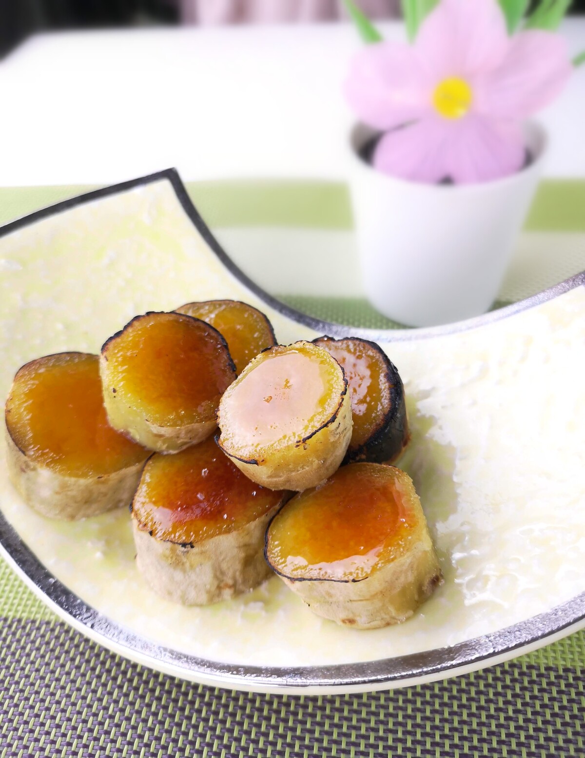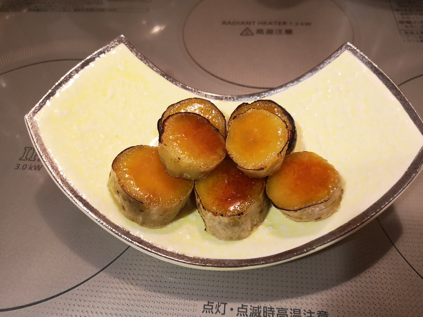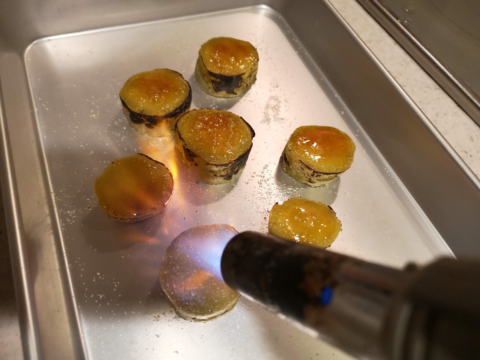 じっくり焼いた焼きいもにグラニュー糖をのせてバーナーで炙りました