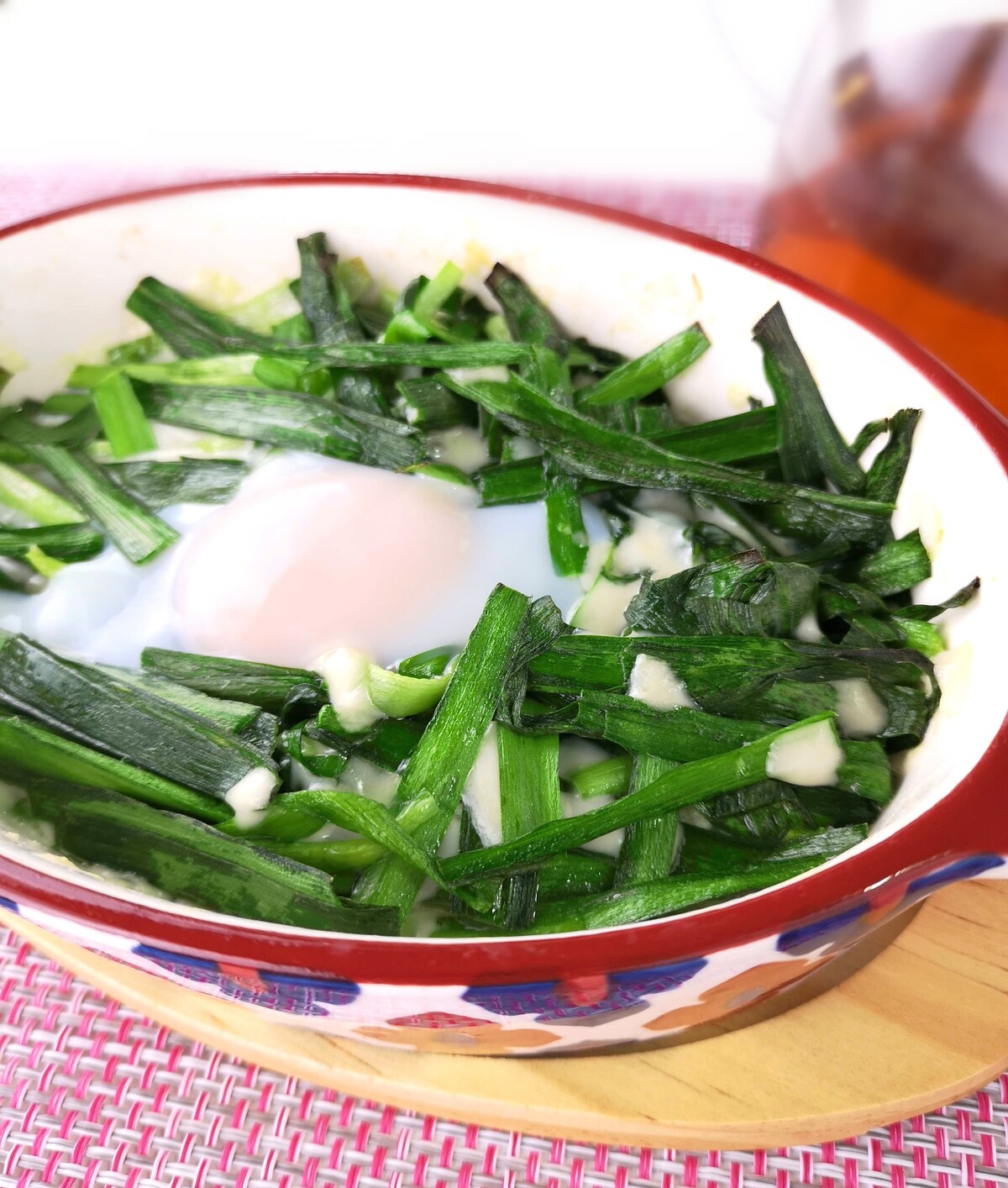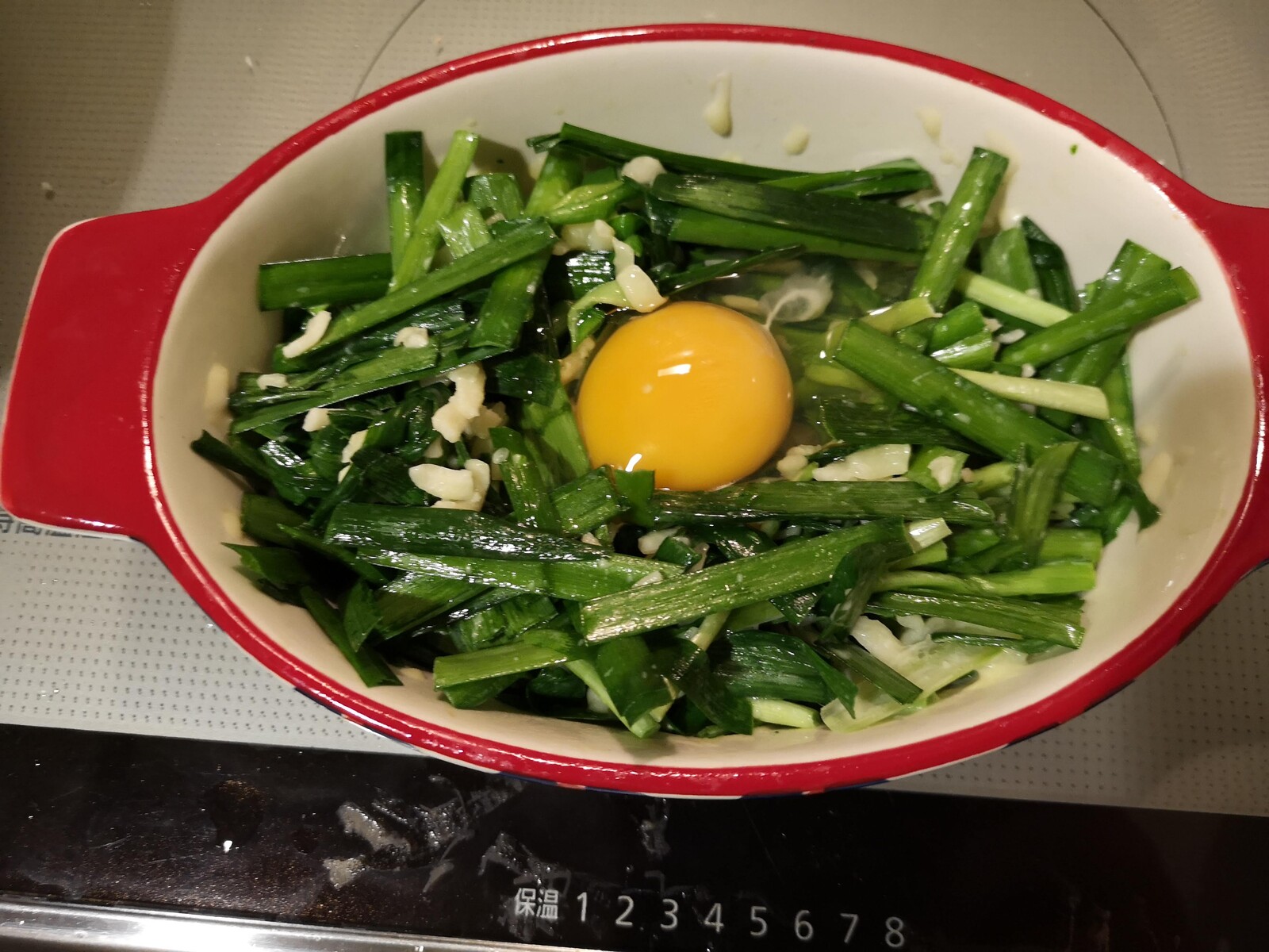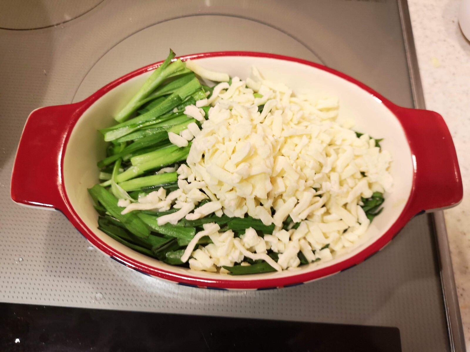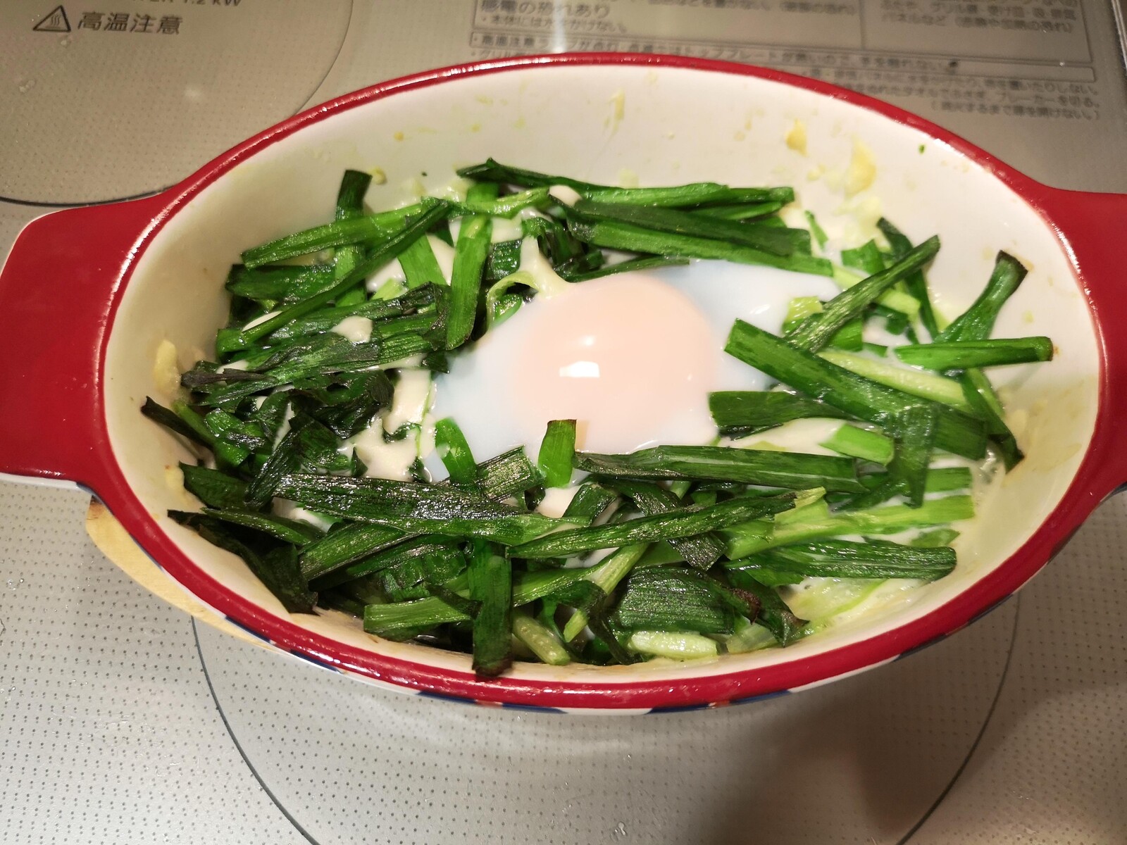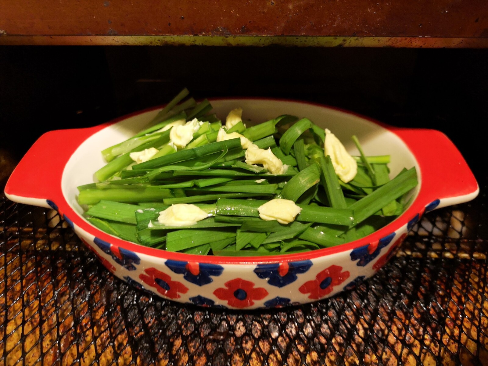 2.耐熱皿にニラを並べて上に均一にバター(10グラム)をのせてトースターで10分焼きます