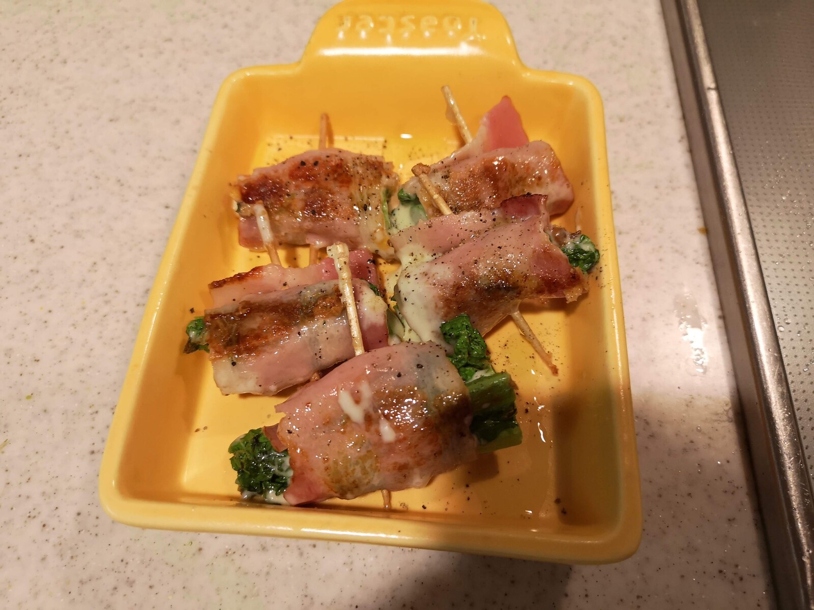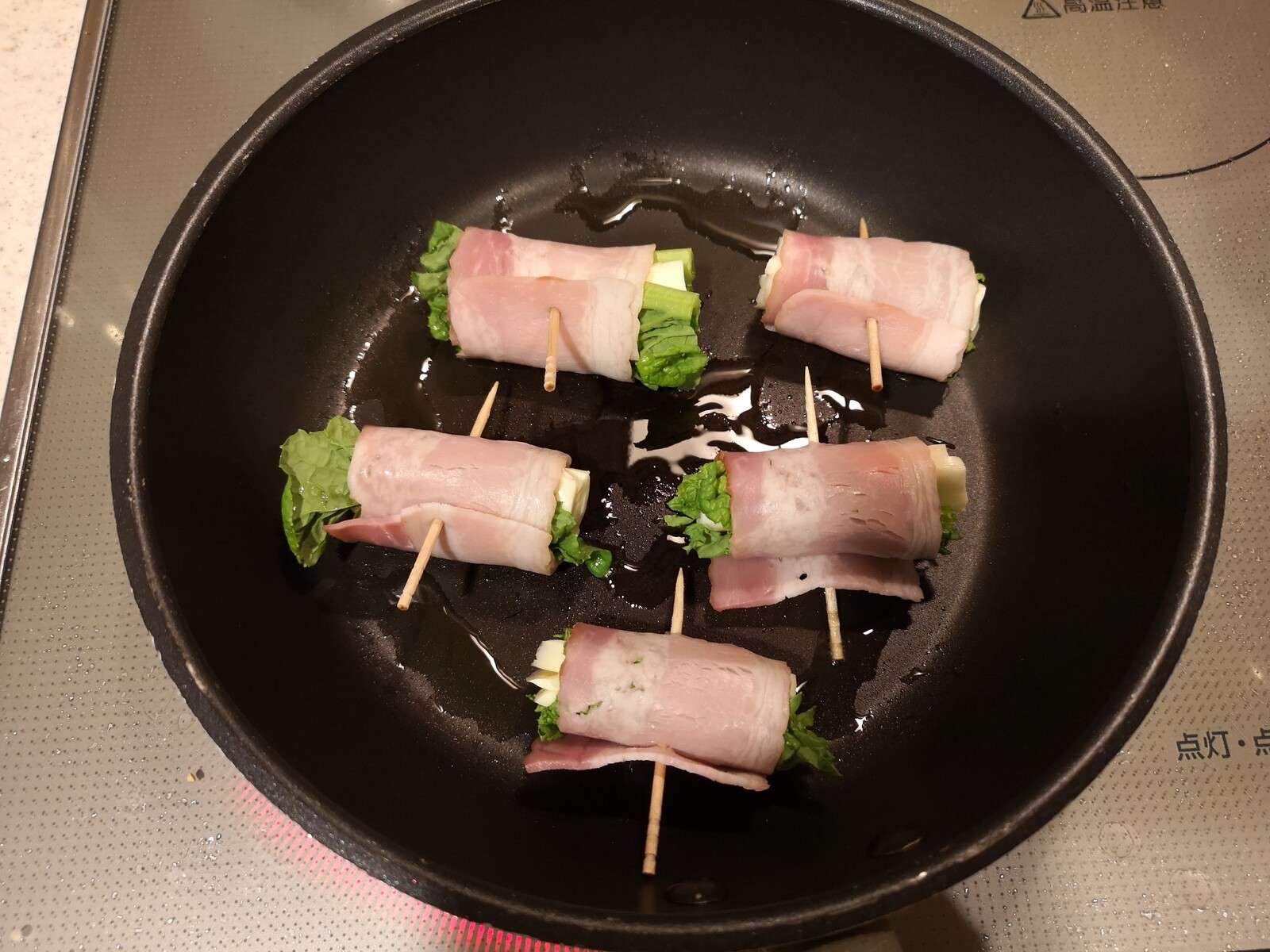 菜の花とチーズをベーコンで巻いて焼きます