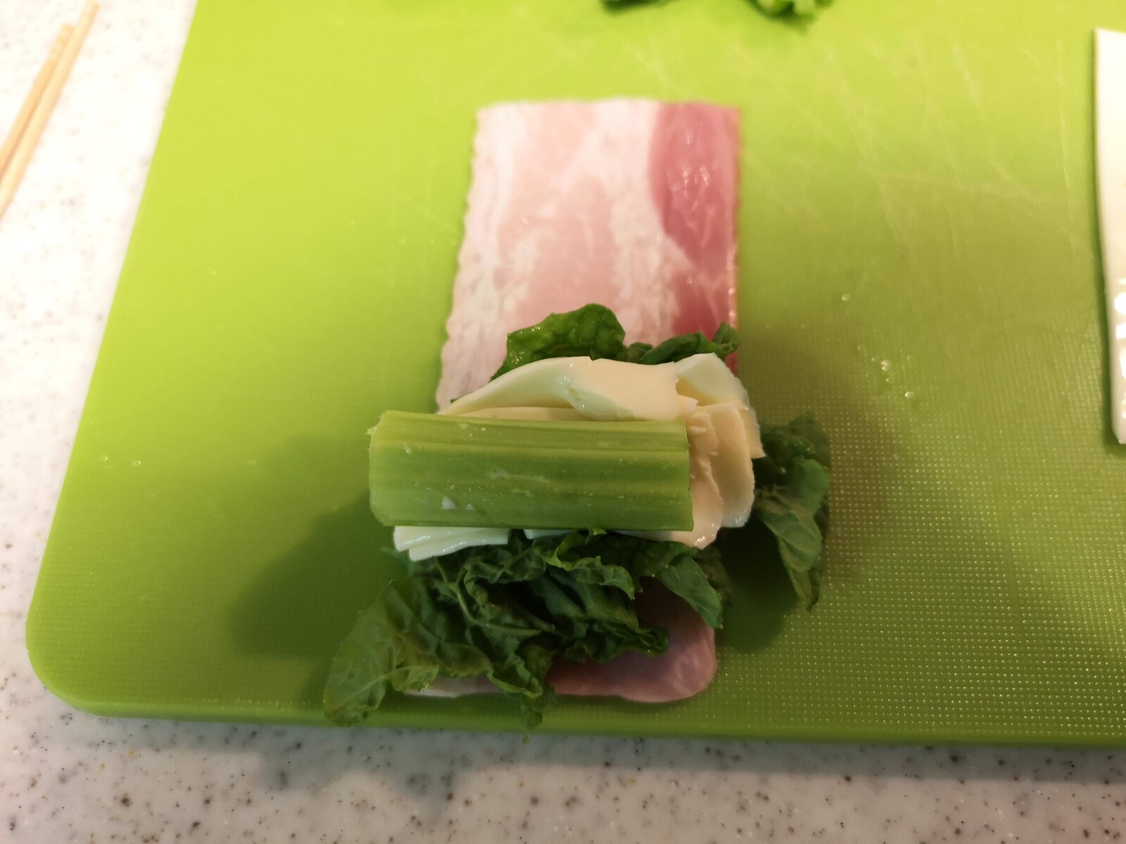 2.ベーコンの上に菜の花、スライスチーズの順にのせて巻きます