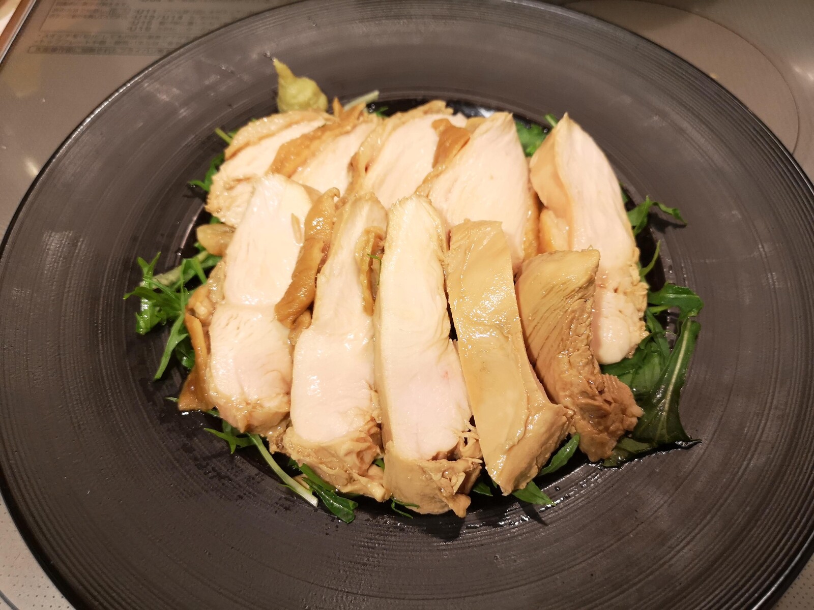 6.お皿に4センチ幅に切った水菜(50グラム)を敷いて上に鶏むね肉をのせたら出来上がり