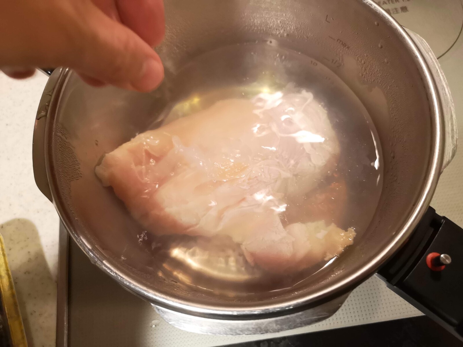1.鍋に水(1リットル)を入れて沸騰させて鶏むね肉(350グラム)を入れて30秒ほどそのまま沸かします